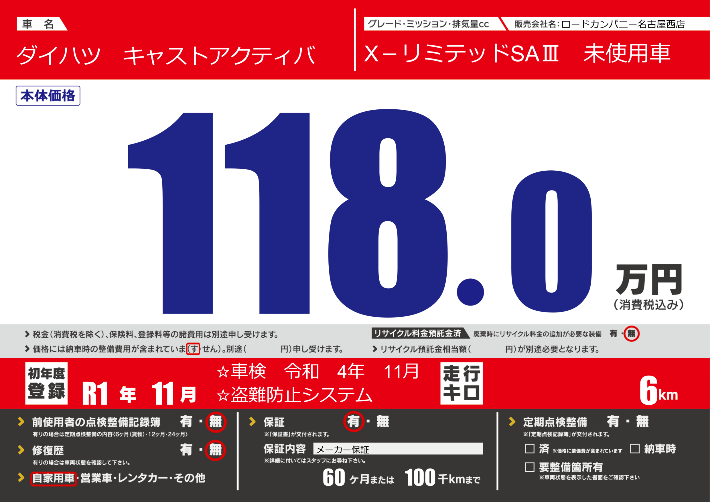 | 走行キロ | 0.6万km | 初年度登録 | R1年11月 |