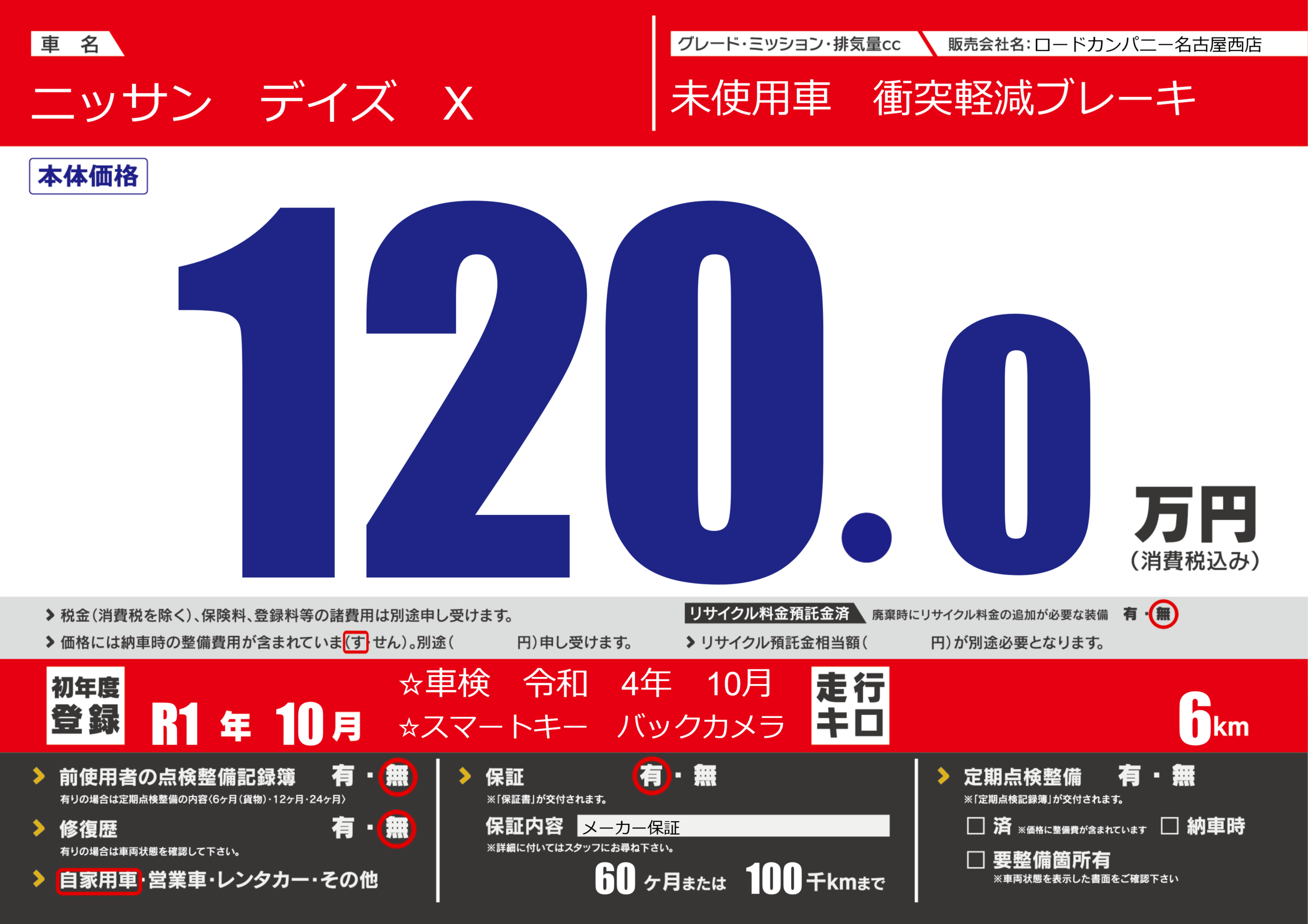 | 車名 | ニッサン デイズ X | グレード ミッション 排気量 |