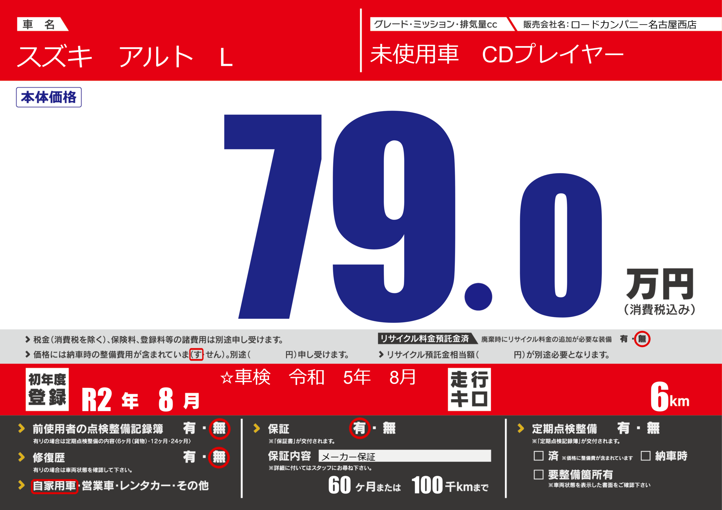| 車名 | スズキ アルト L | グレード ミッション 排気量 |