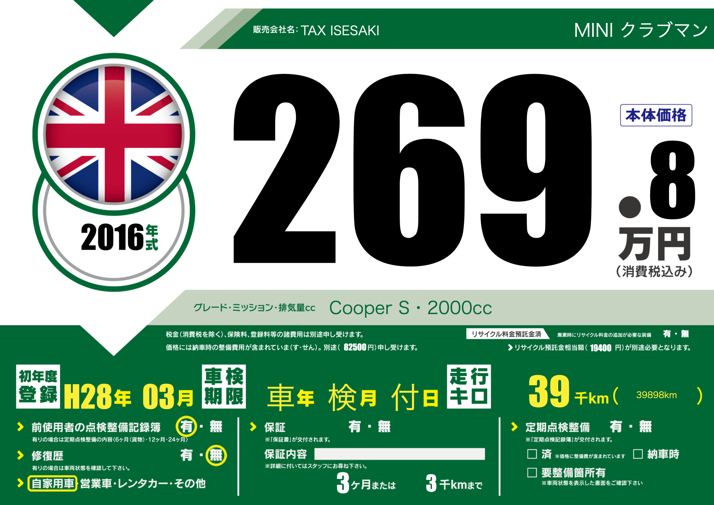 | 車名 | MINI クラブマン | グレード ミッション 排気量 |
