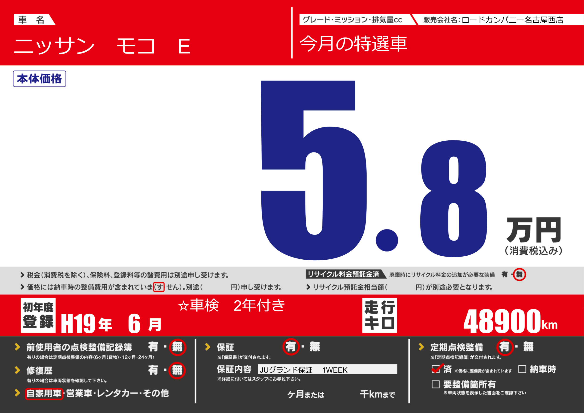 | 定期点検整備 | 定期点検整備あり 定期点検整備済み | ||