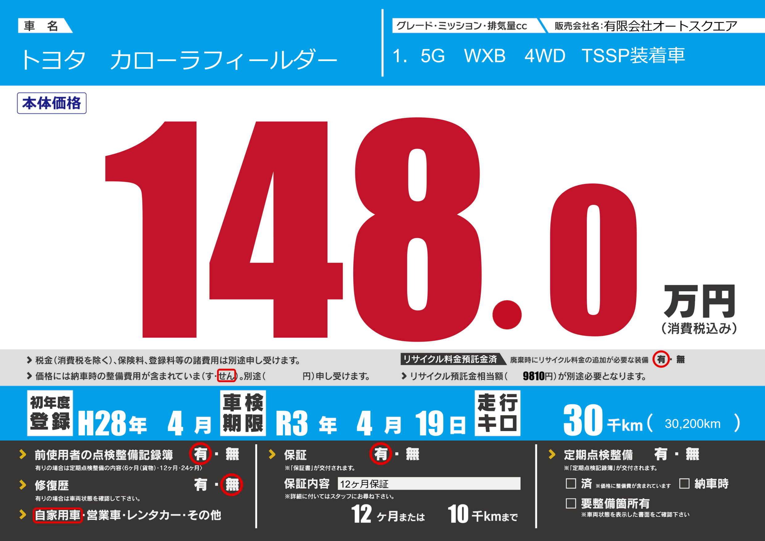 | 走行キロ | 3万km | 初年度登録 | H28年4月 |