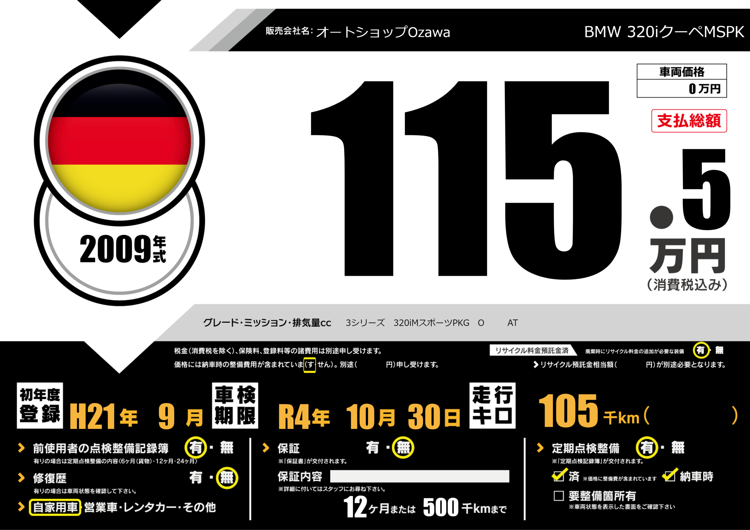 | 車名 | BMW 320iクーペMSPK | グレード ミッション 排気量 |