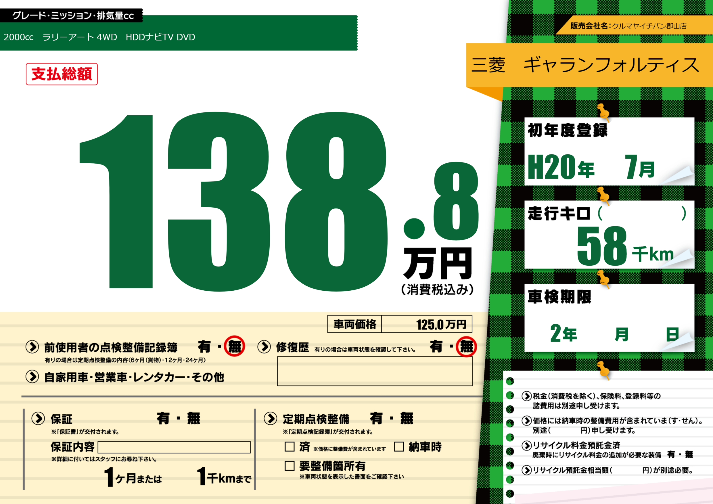 | 車名 | 三菱 ギャランフォルティス | グレード ミッション 排気量 |