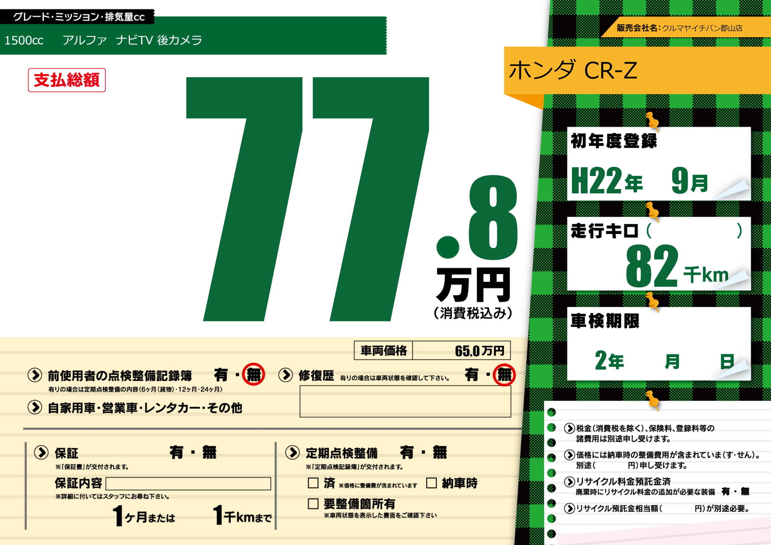 | 車名 | ホンダ CR-Z | グレード ミッション 排気量 |