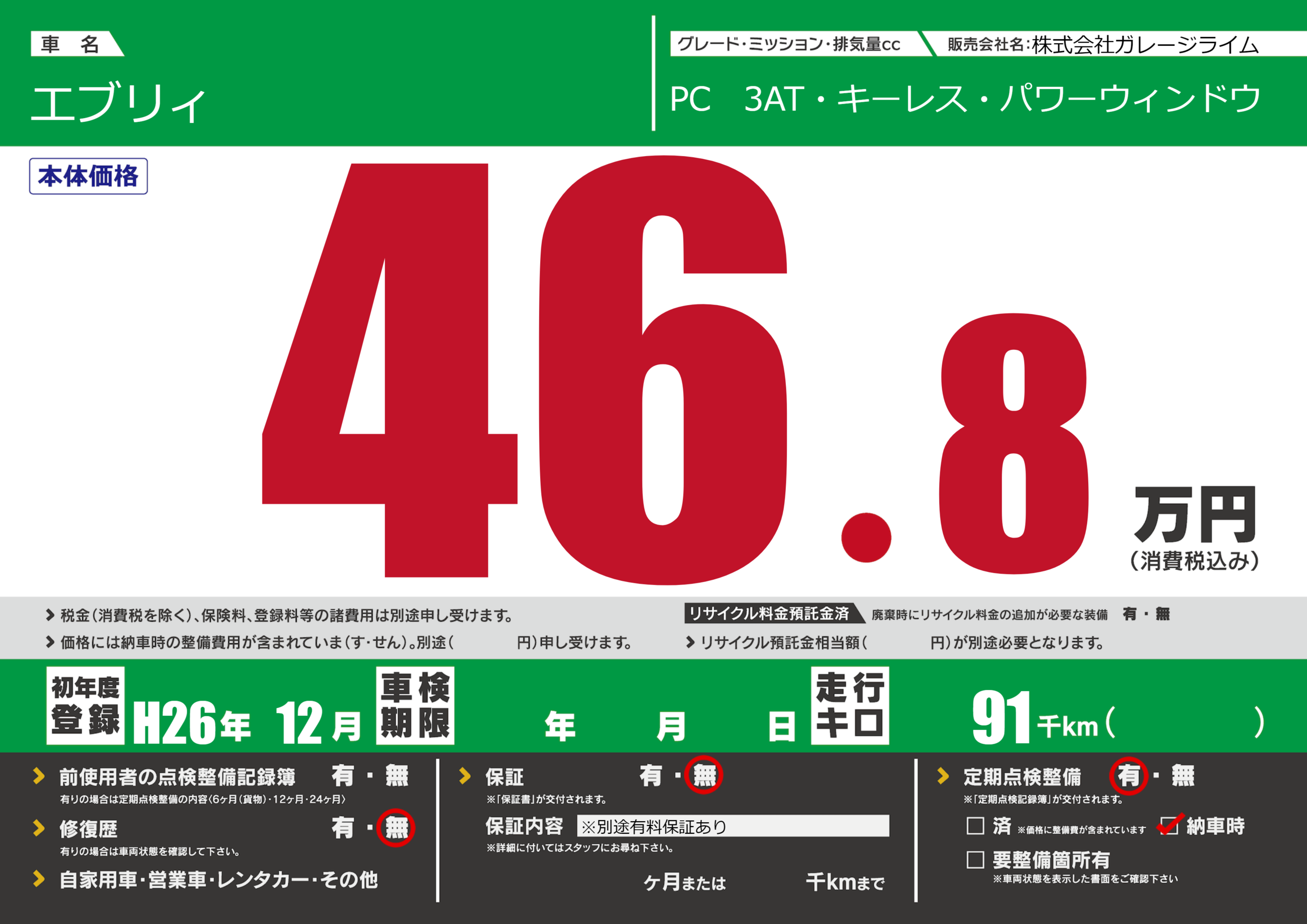 | 車名 | エブリィ | グレード ミッション 排気量 |