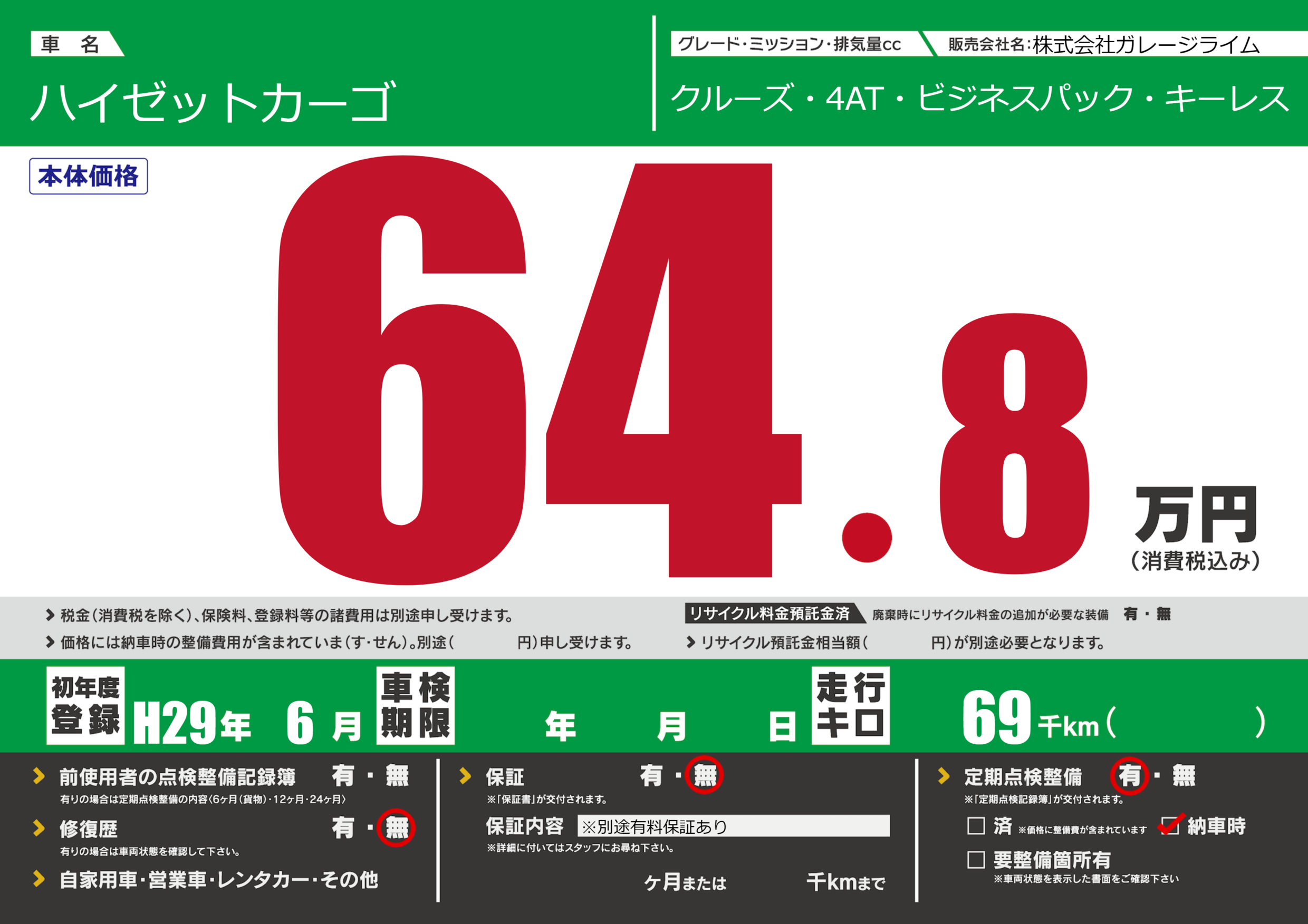 | 定期点検整備 | 定期点検整備あり 納車時あり | ||