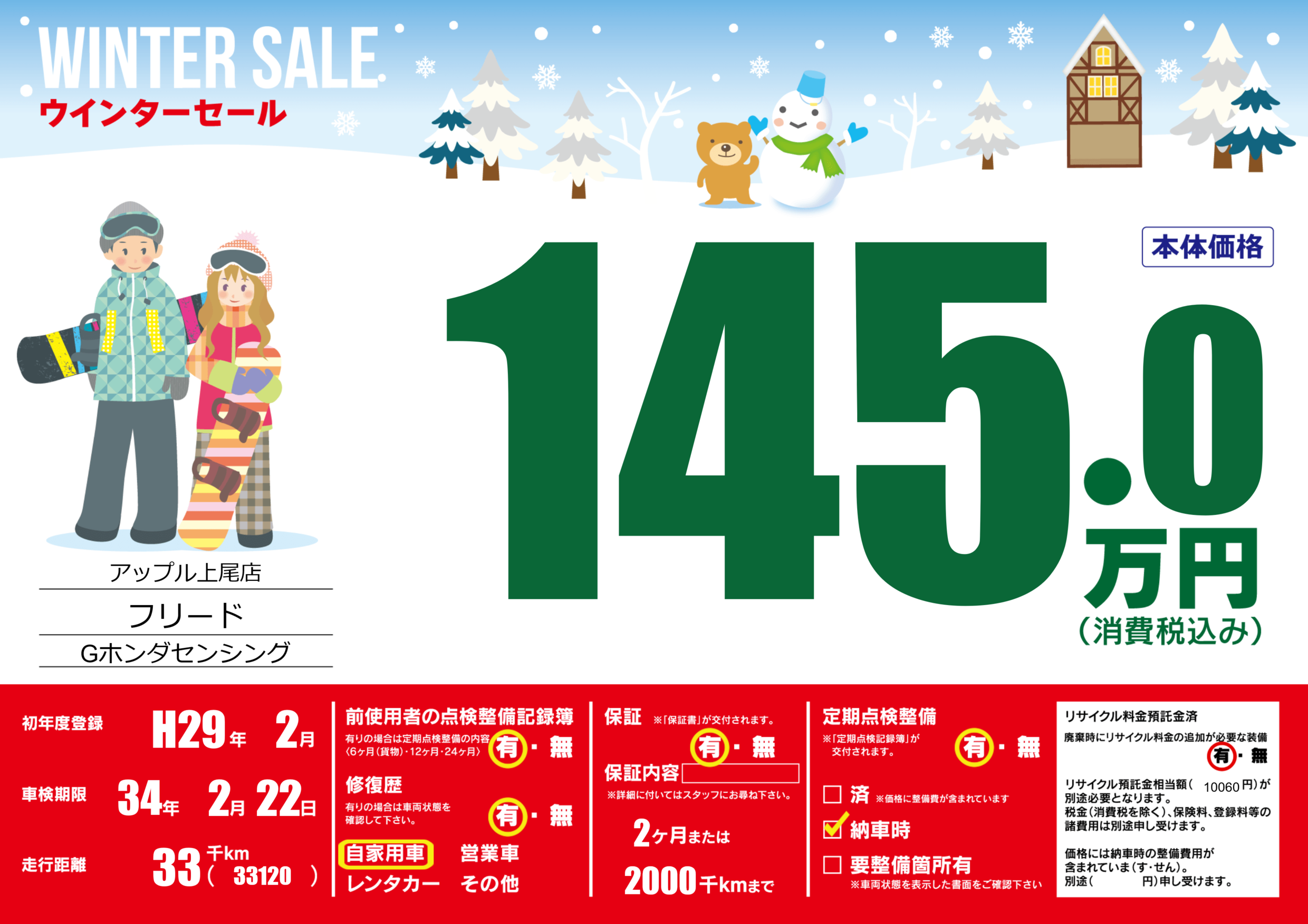| 走行キロ | 3.3万km | 初年度登録 | H29年2月 |