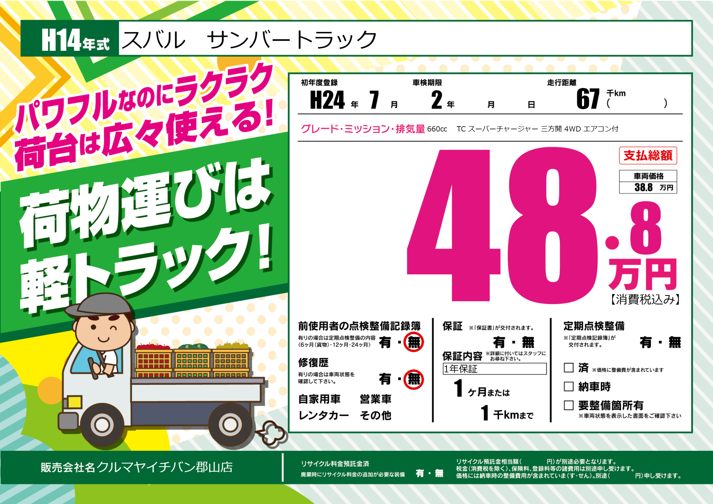 | 車名 | スバル サンバートラック | グレード ミッション 排気量 |