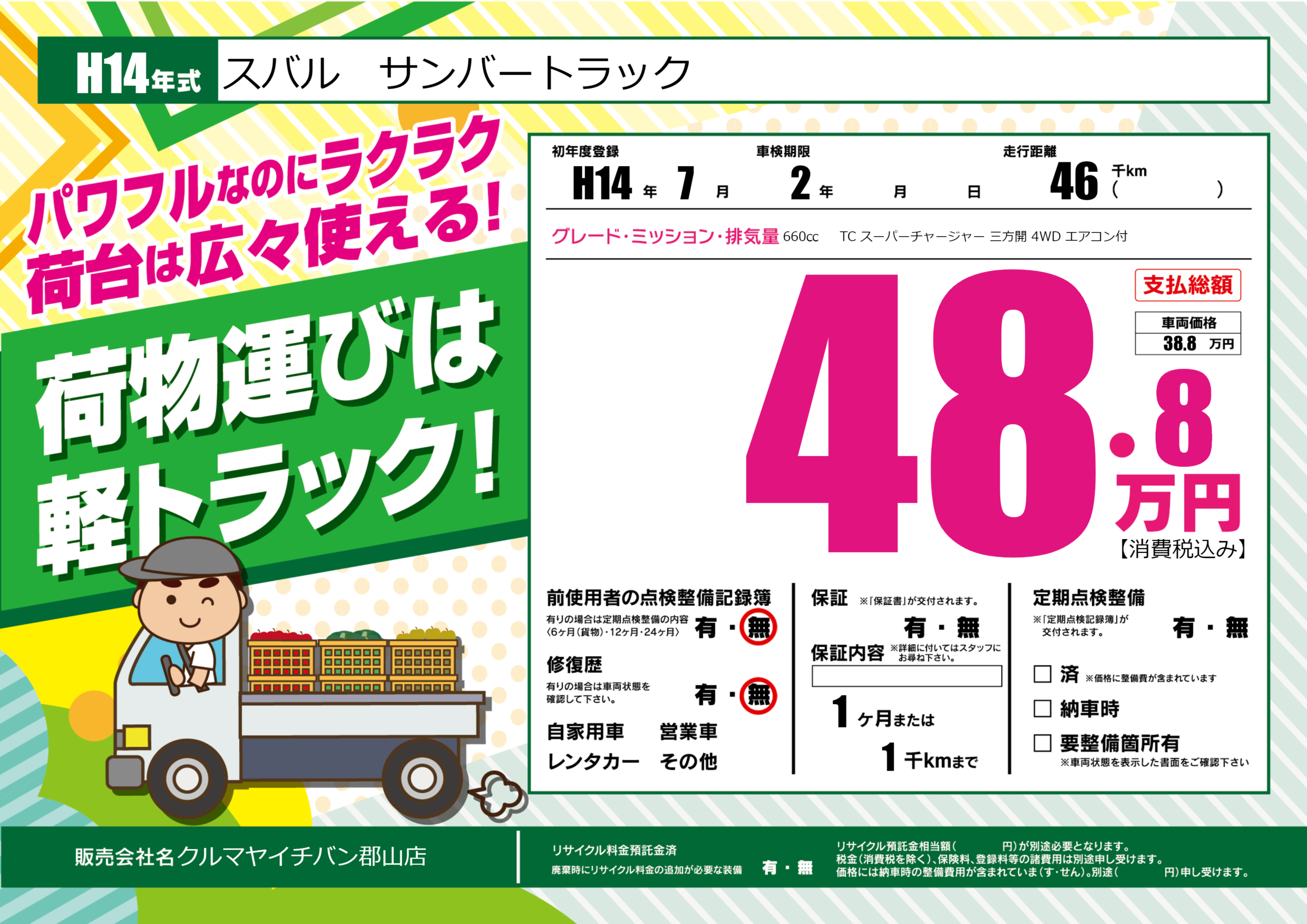 | 車名 | スバル サンバートラック | グレード ミッション 排気量 |