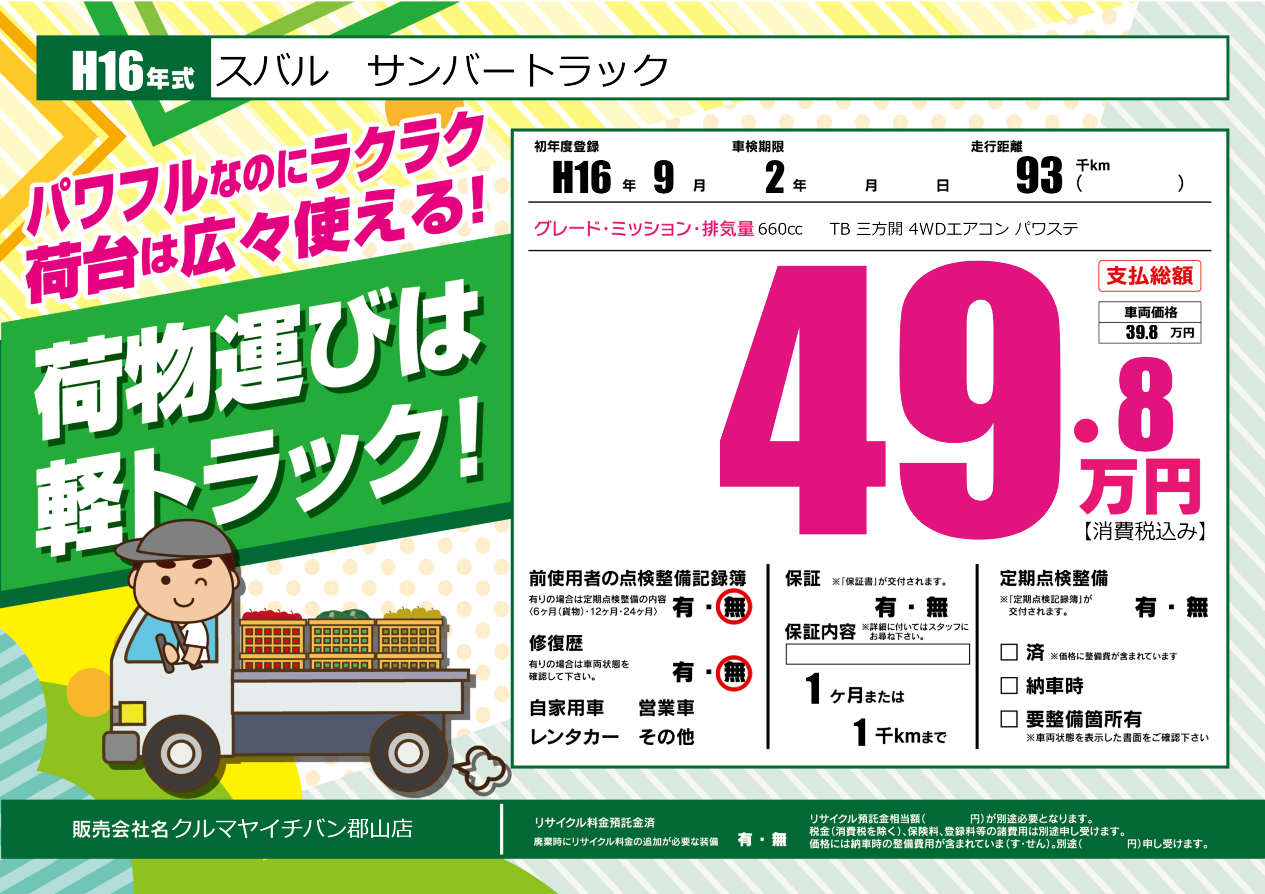 | 走行キロ | 9.3万km | 初年度登録 | H16年9月 |