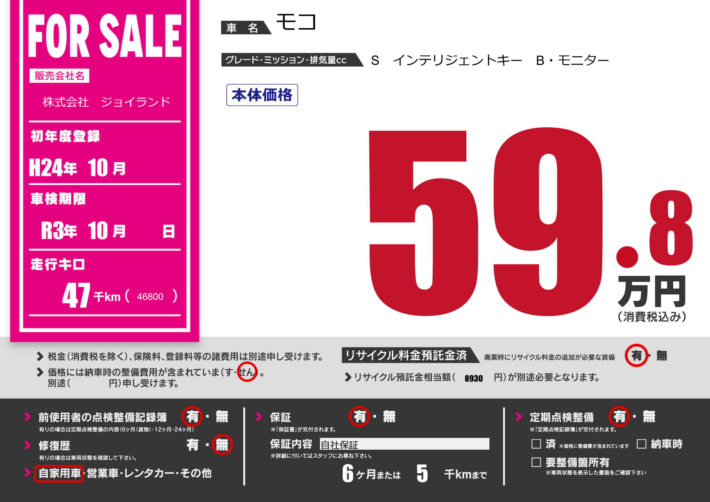 | 走行キロ | 4.7万km | 初年度登録 | H24年10月 |
