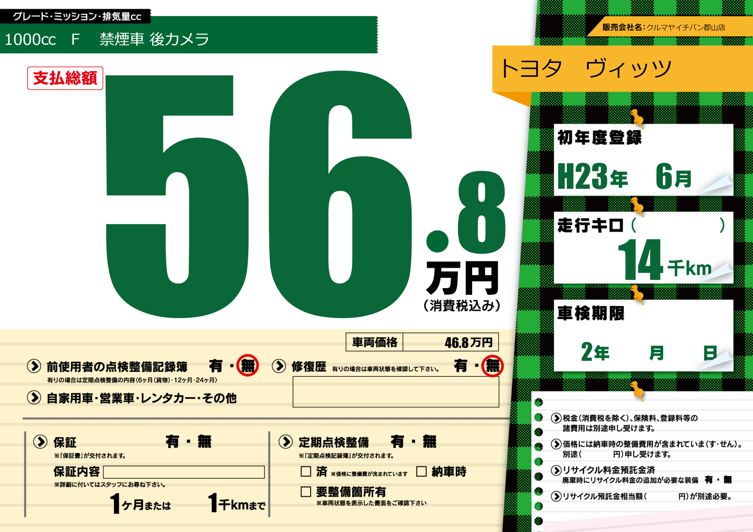 | 車名 | トヨタ ヴィッツ | グレード ミッション 排気量 |