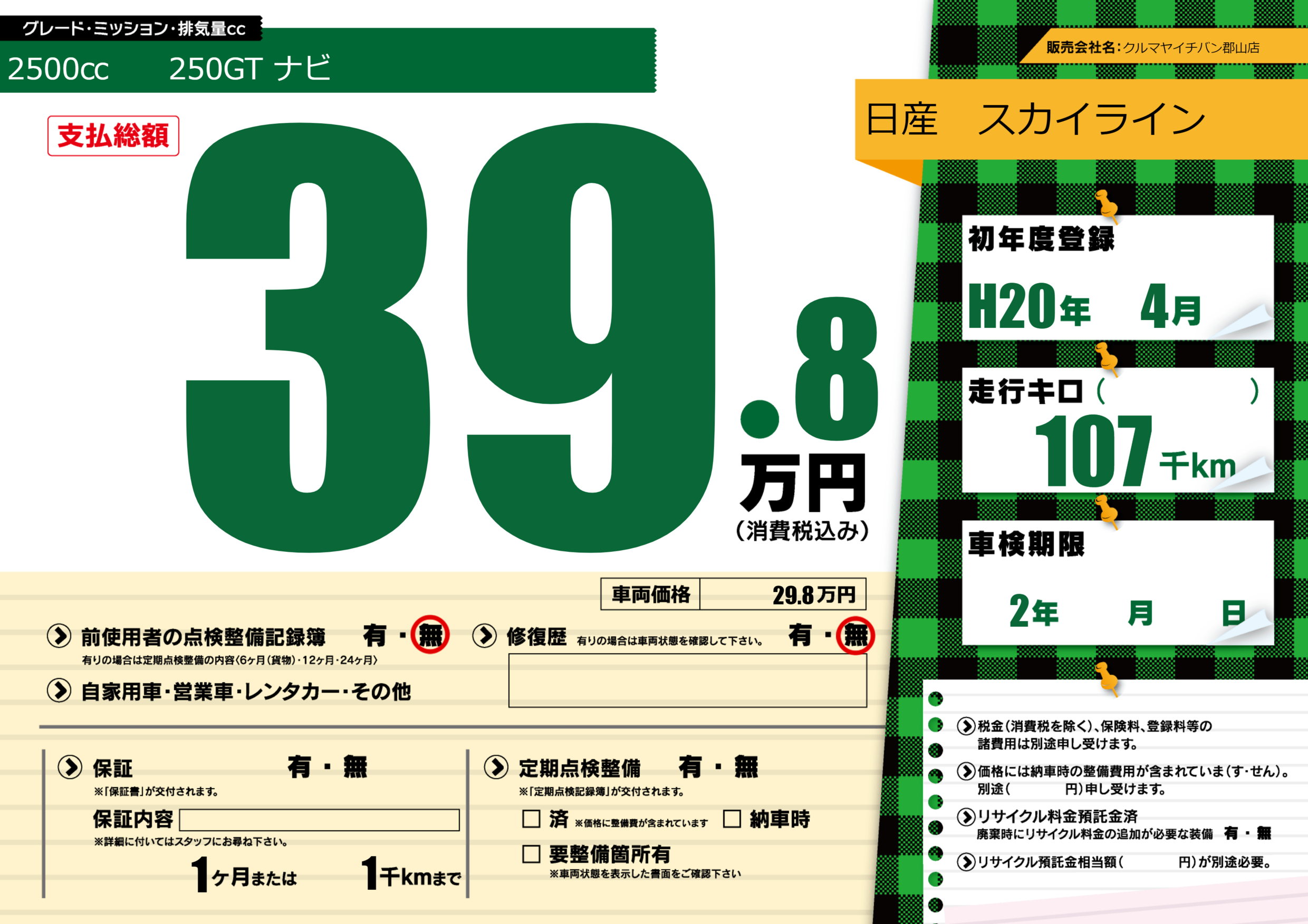 | 車名 | 日産 スカイライン | グレード ミッション 排気量 |