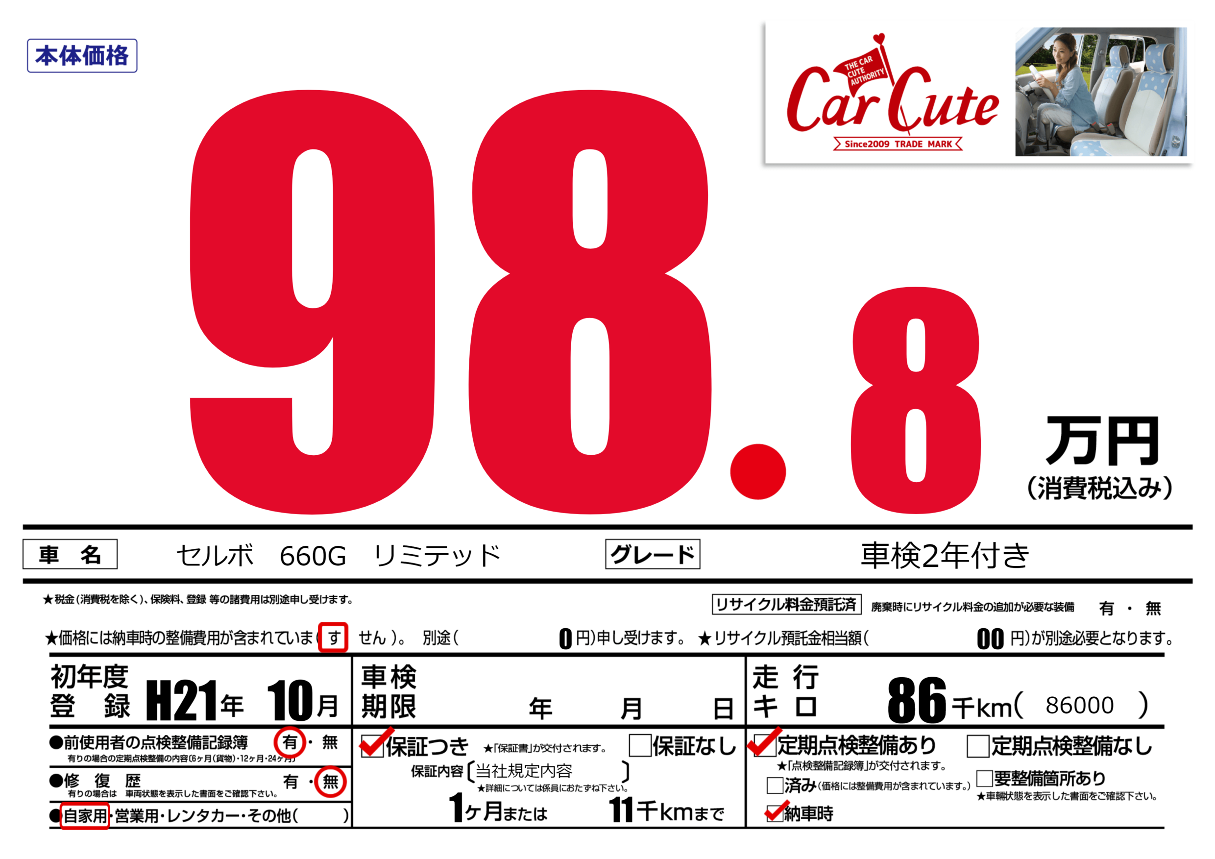 保証付き 保証内容(当社規定内容) 1ヶ月または(11)千kmまで |
