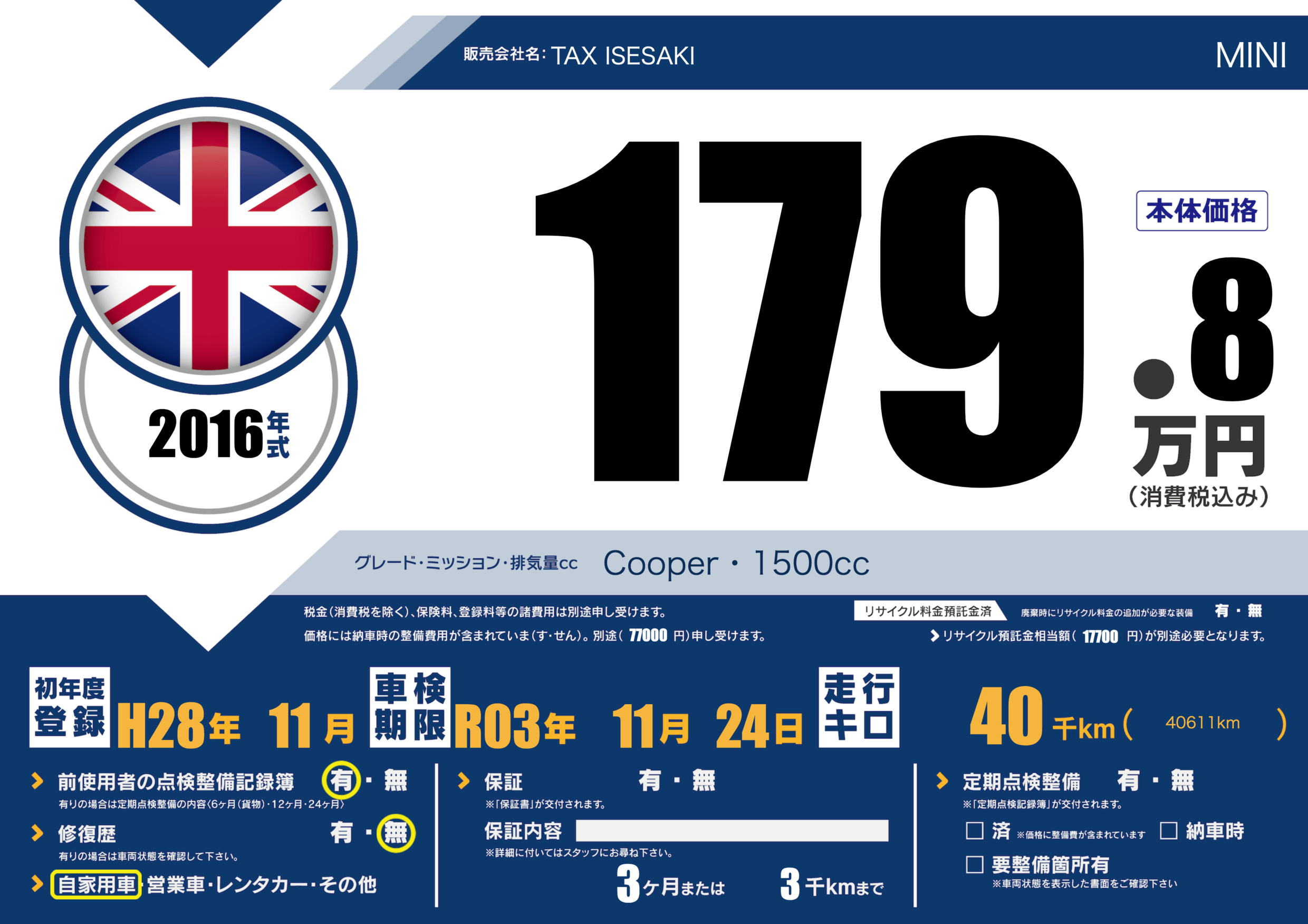 | 走行キロ | 4万km | 初年度登録 | H28年11月 |
