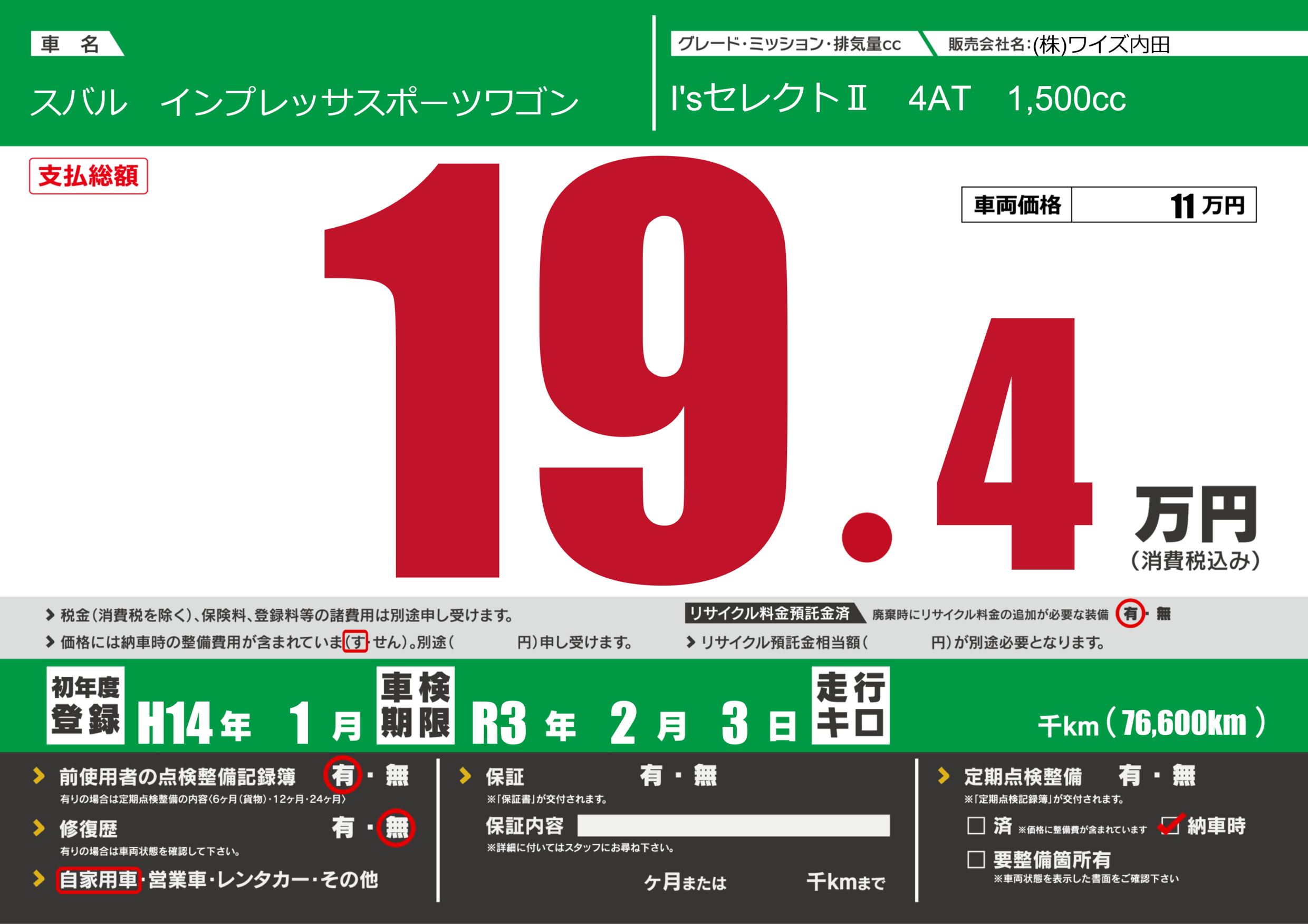 あり | 車検制限 | R3年2月3月 |