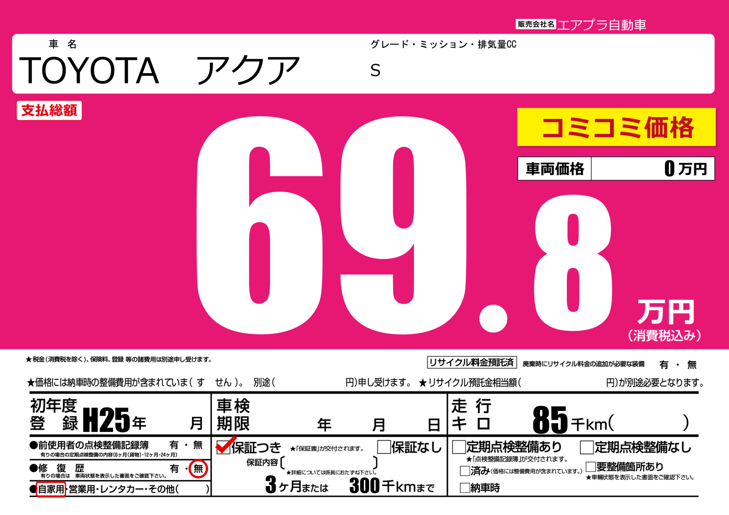 | 車名 | TOYOTA アクア | グレード ミッション 排気量 |