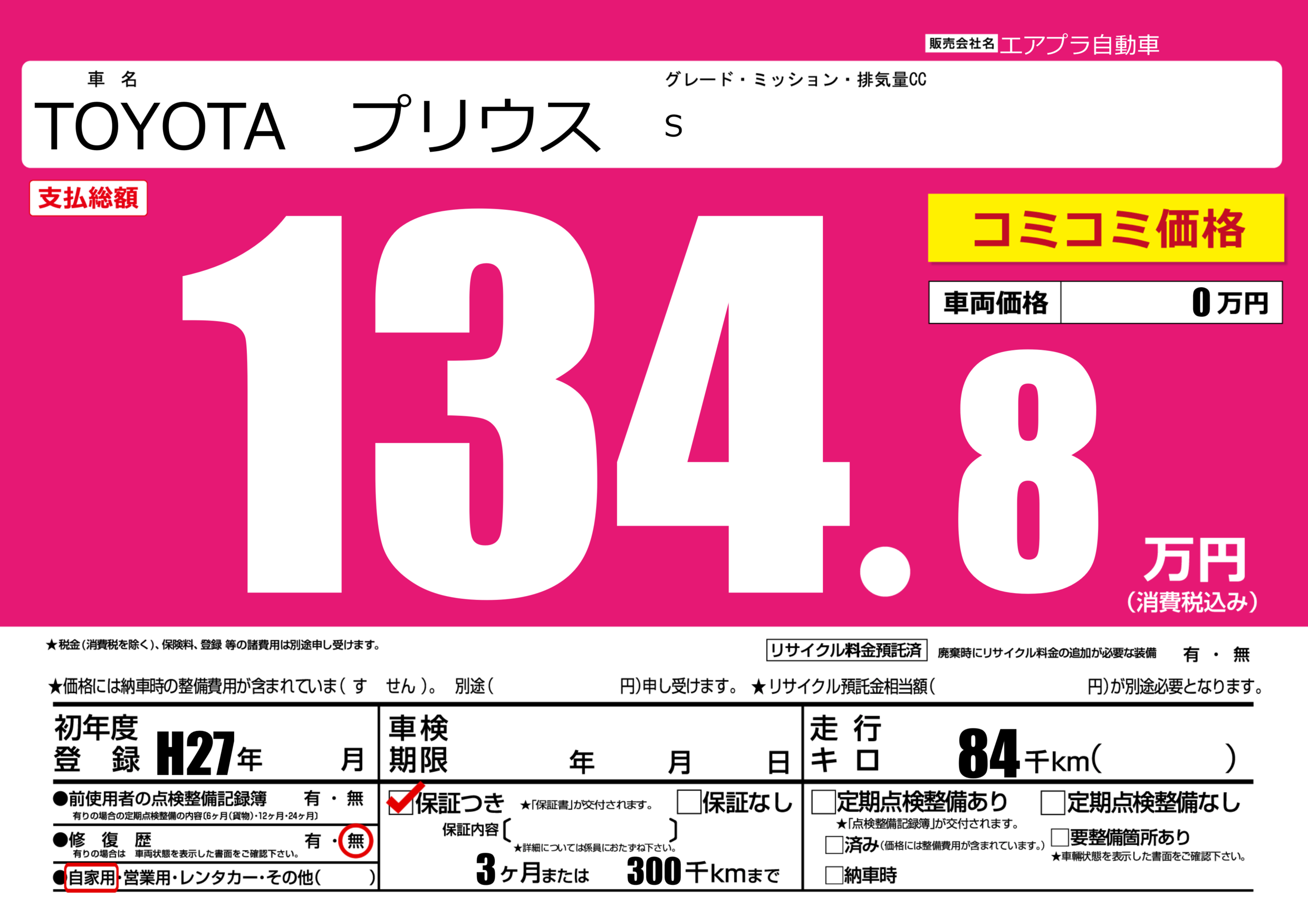 | 車名 | TOYOTA プリウス | グレード ミッション 排気量 |