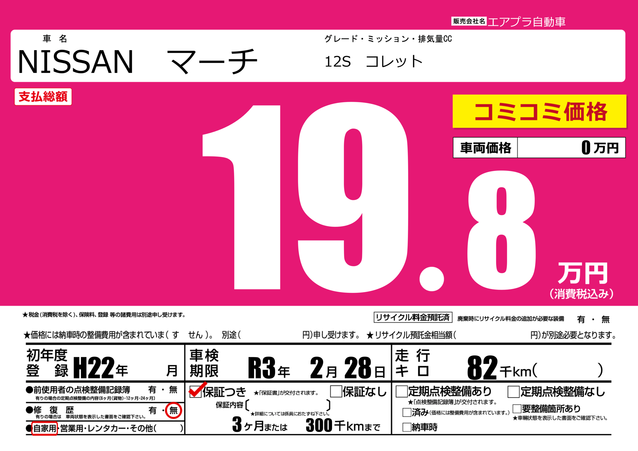 | 車名 | NISSAN マーチ | グレード ミッション 排気量 |