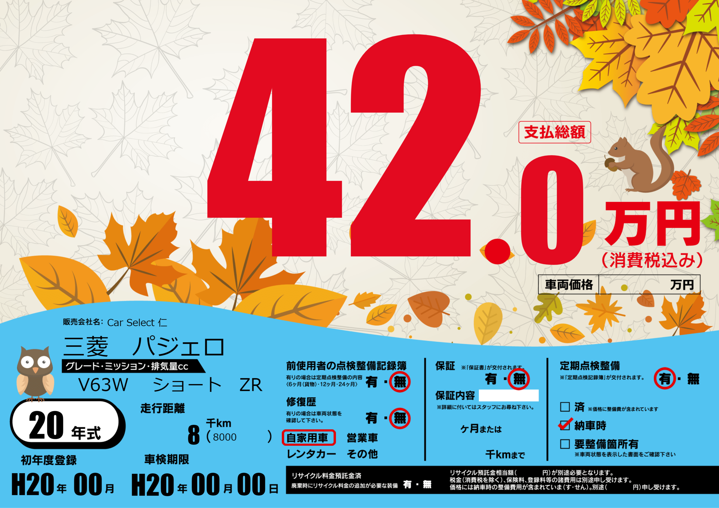 | 車名 | 三菱 パジェロ(売約済) | グレード ミッション 排気量 |