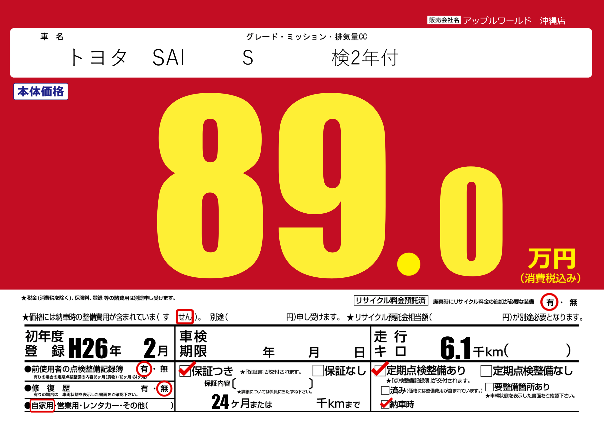 | 車名 | トヨタ SAI | グレード ミッション 排気量 |