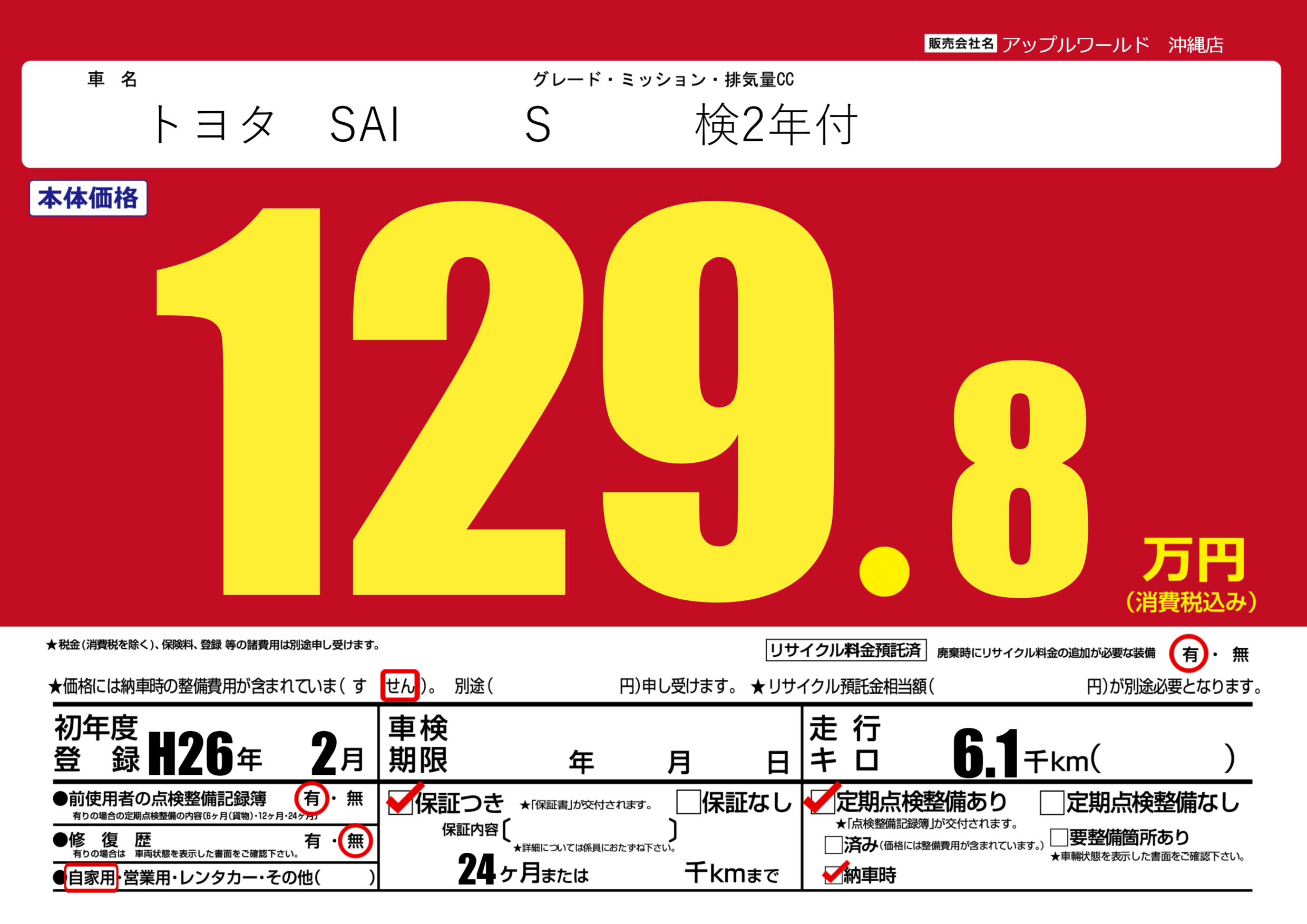 保証付き 保証内容(---) 24ヶ月または()千kmまで |