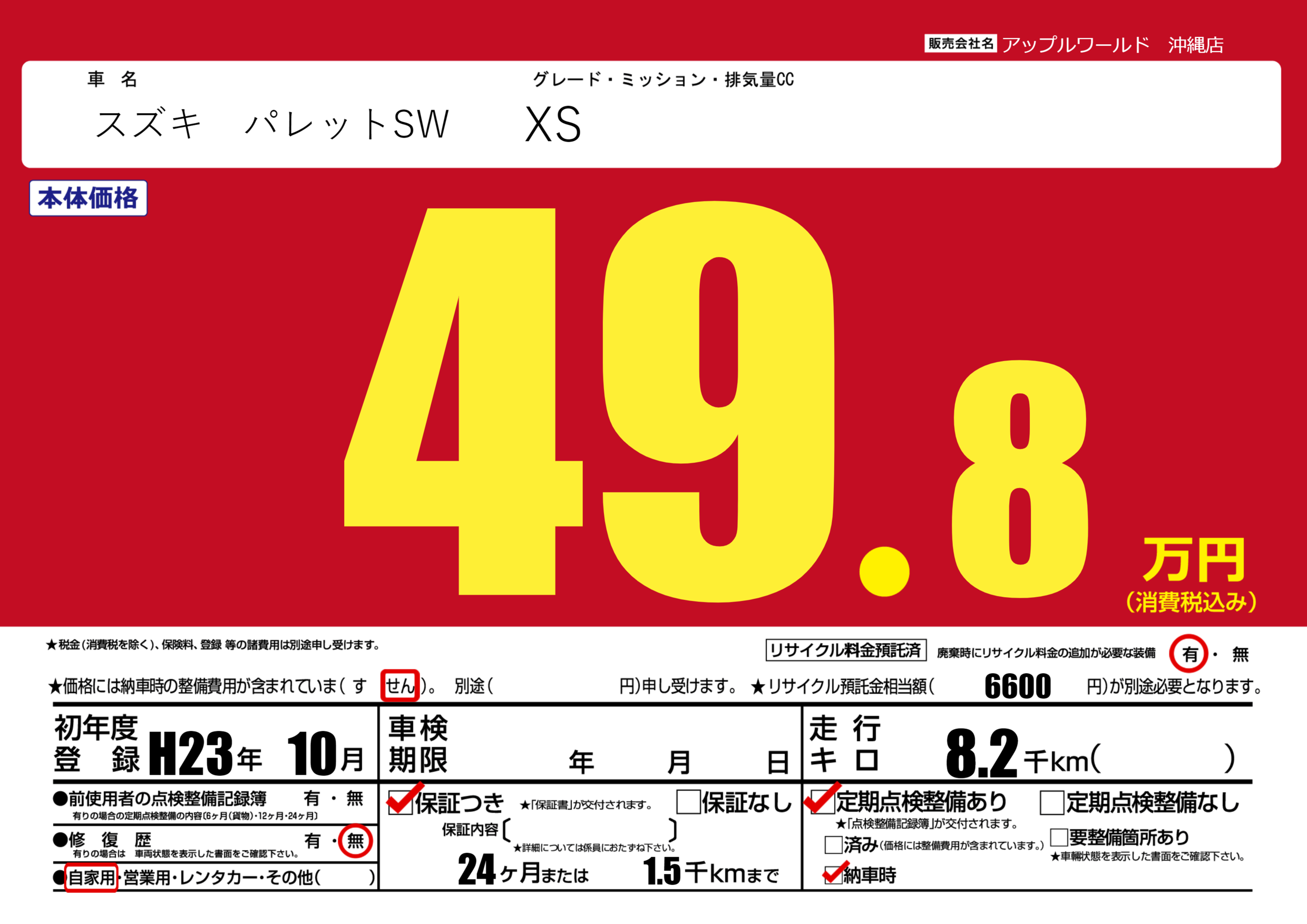 | 車名 | スズキ パレットSW | グレード ミッション 排気量 |