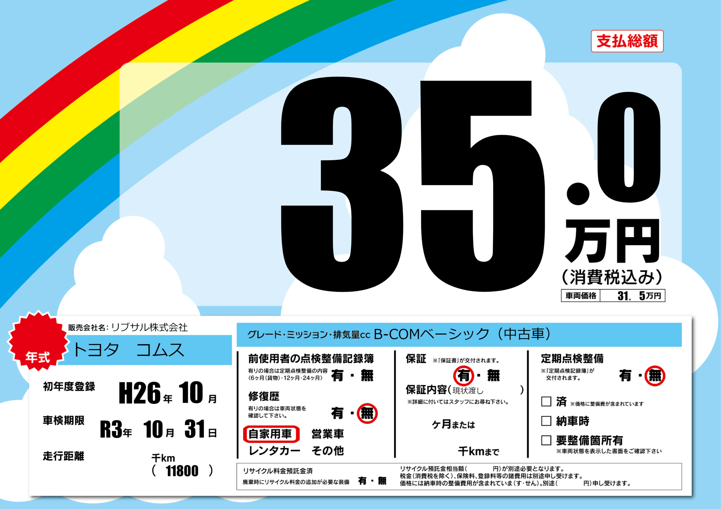 | 車名 | トヨタ コムス | グレード ミッション 排気量 |