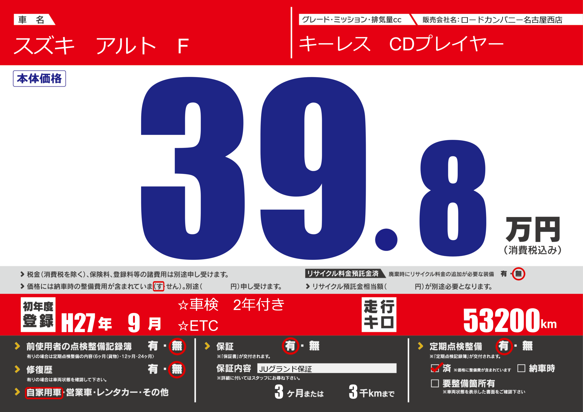 | 定期点検整備 | 定期点検整備あり 定期点検整備済み | ||