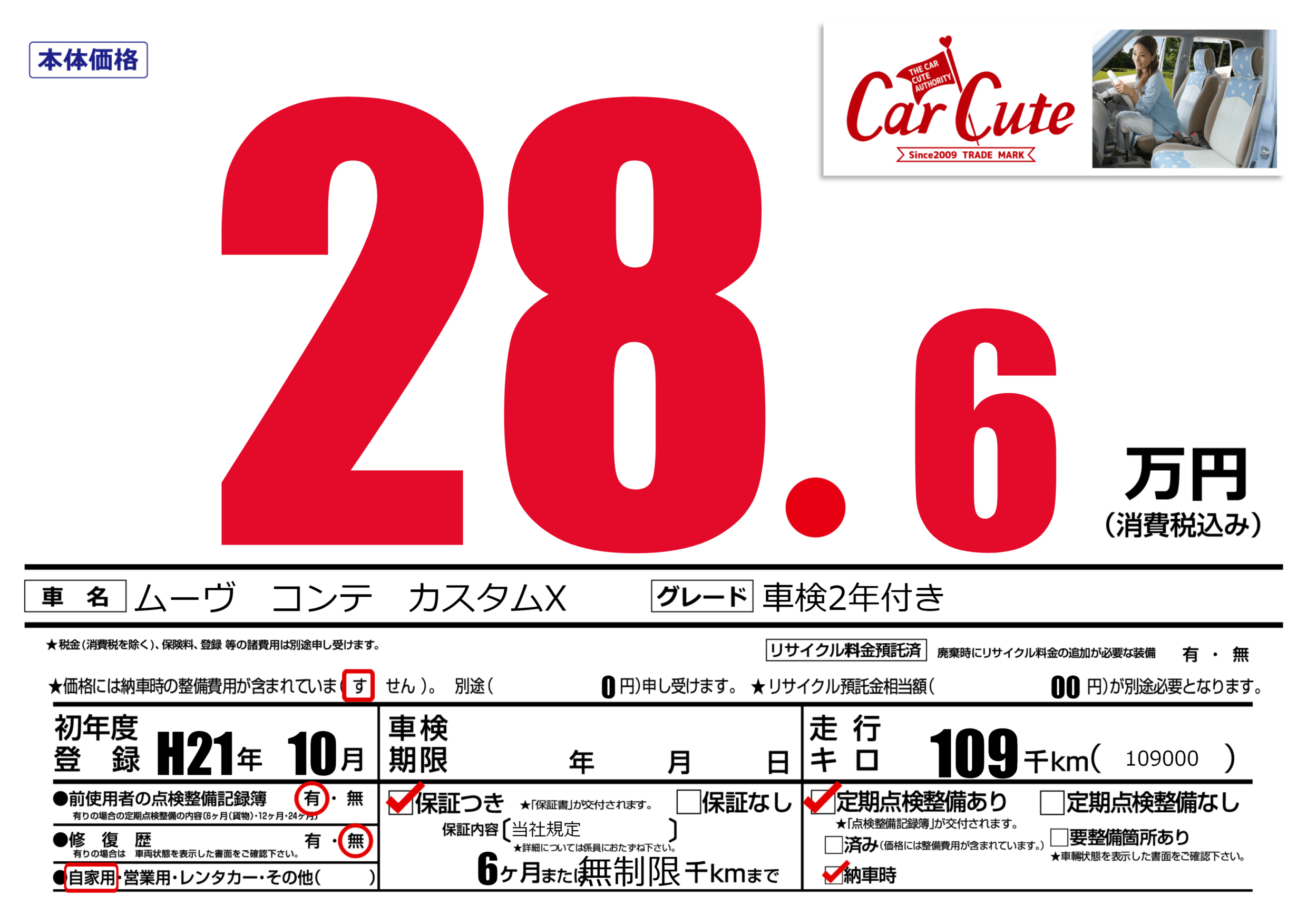 | 走行キロ | 10.9万km | 初年度登録 | H21年10月 |
