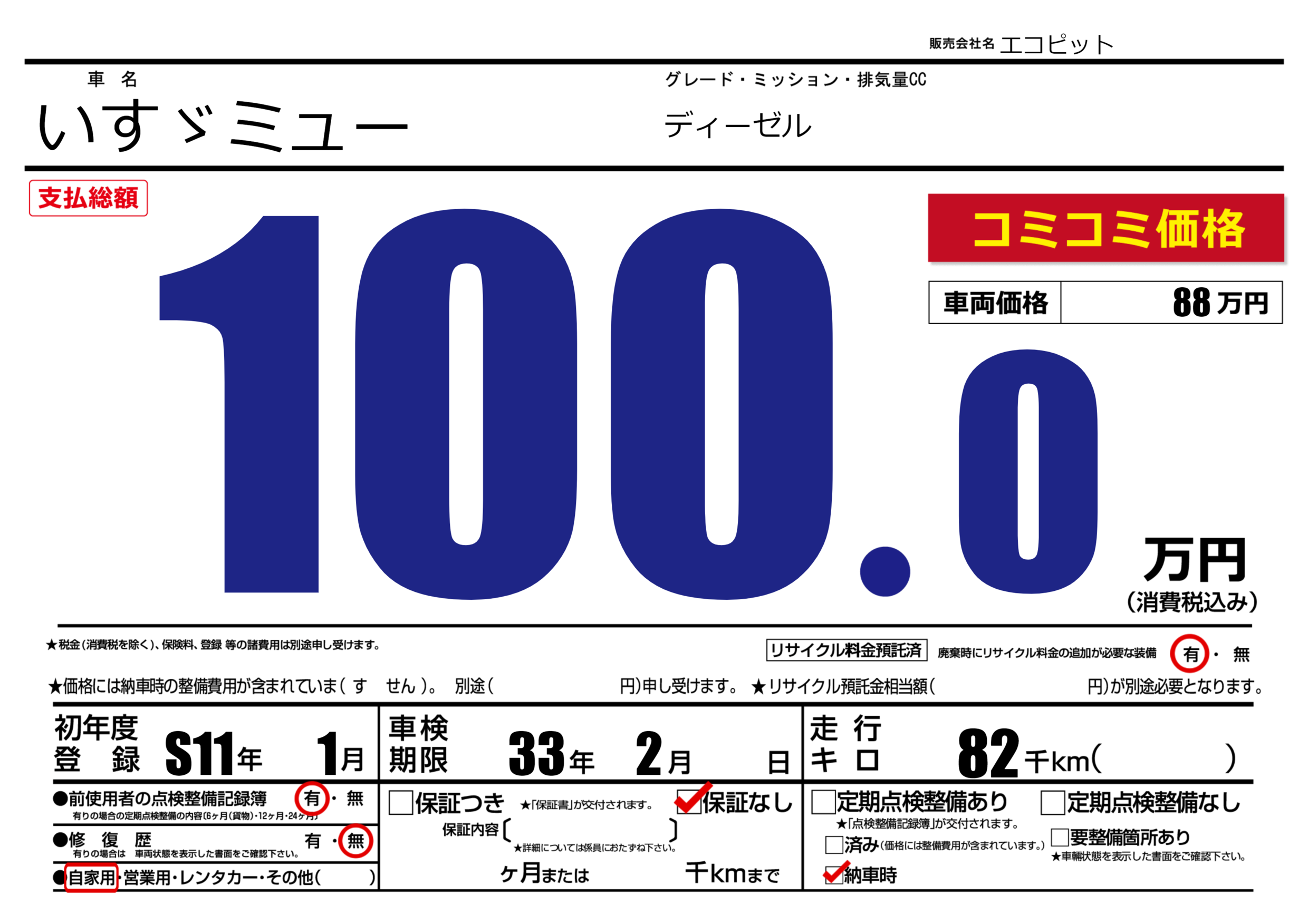 なし | 車検制限 | 33年2月---月 |
