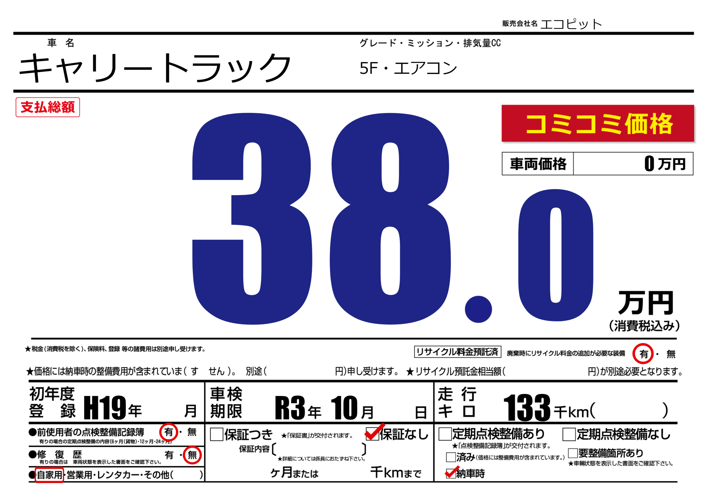 | 車名 | キャリートラック | グレード ミッション 排気量 |