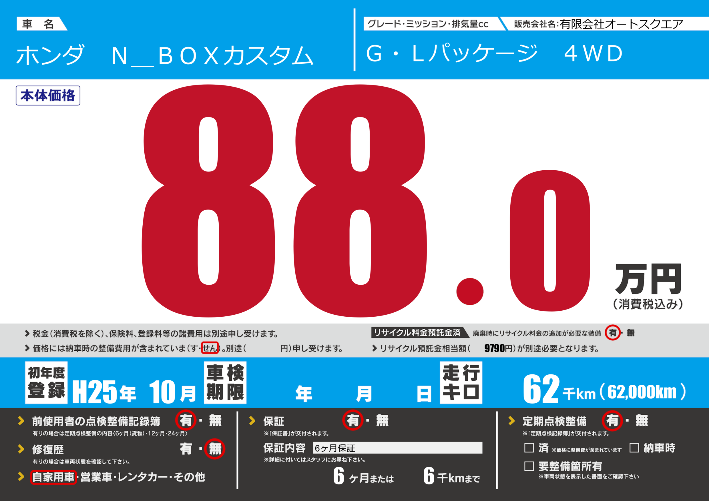 | 車名 | ホンダ N_BOXカスタム | グレード ミッション 排気量 |