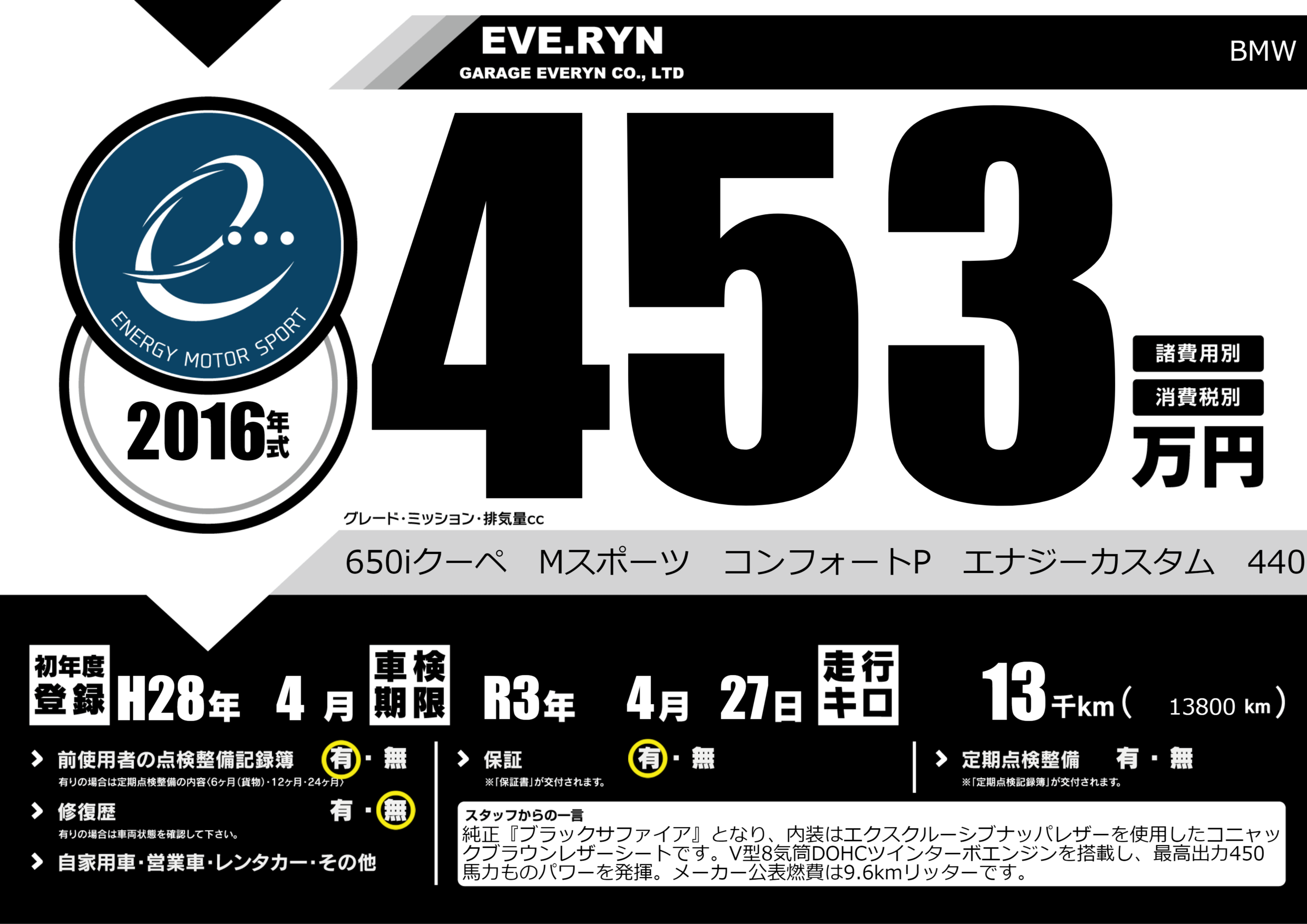 650iクーペ Mスポーツ コンフォートP エナジーカスタム 4400cc |