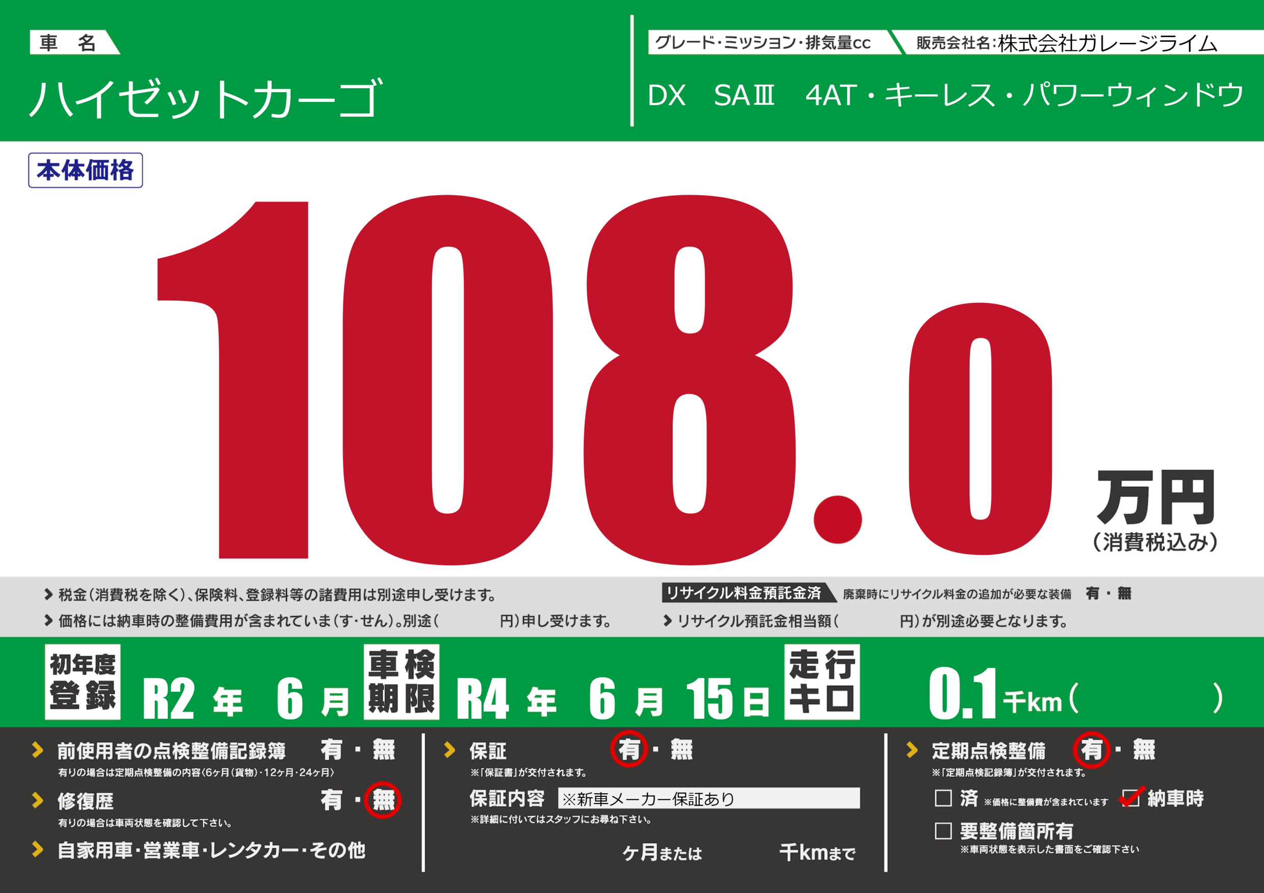 | 車名 | ハイゼットカーゴ | グレード ミッション 排気量 |