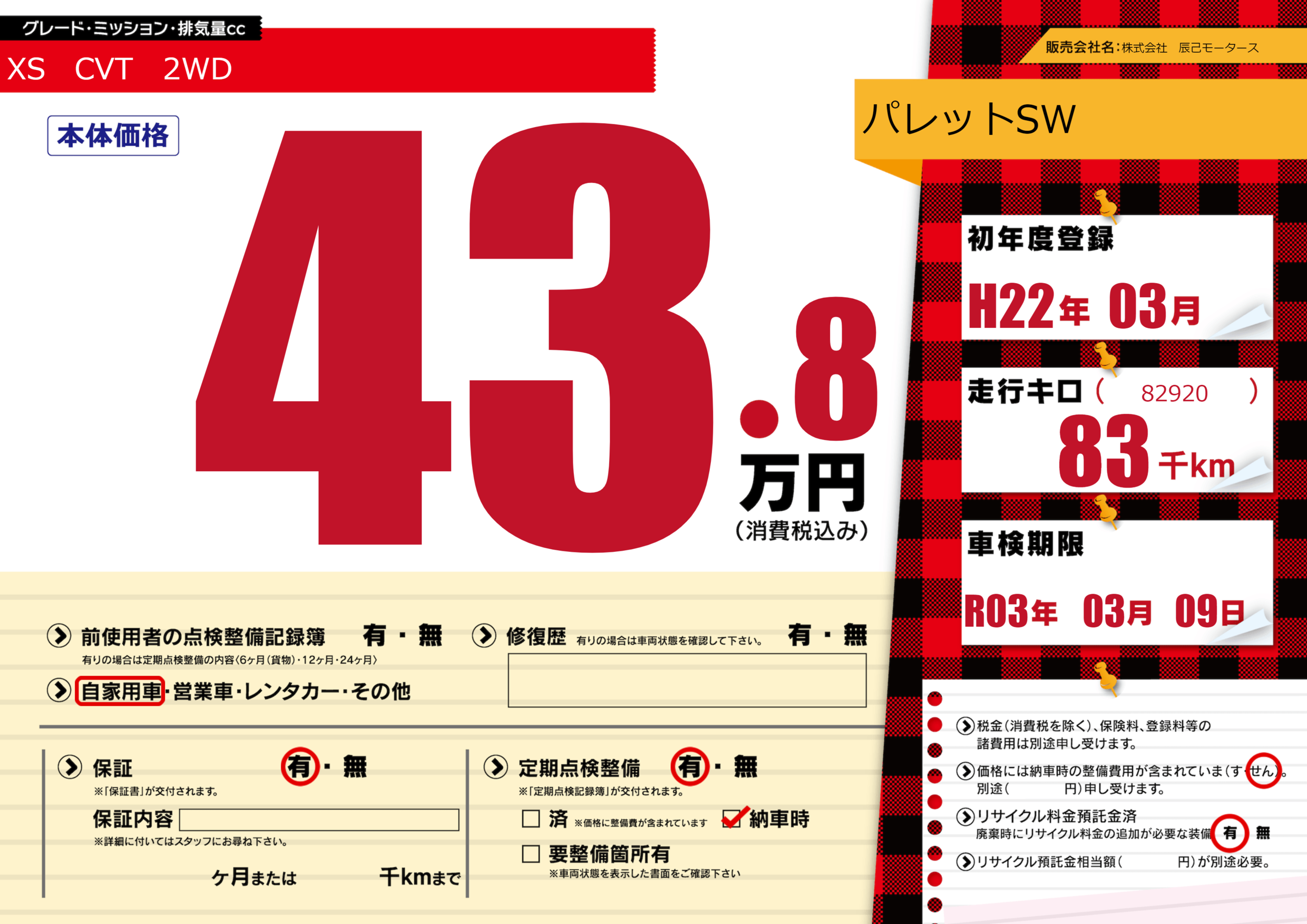 | 車名 | パレットSW | グレード ミッション 排気量 |
