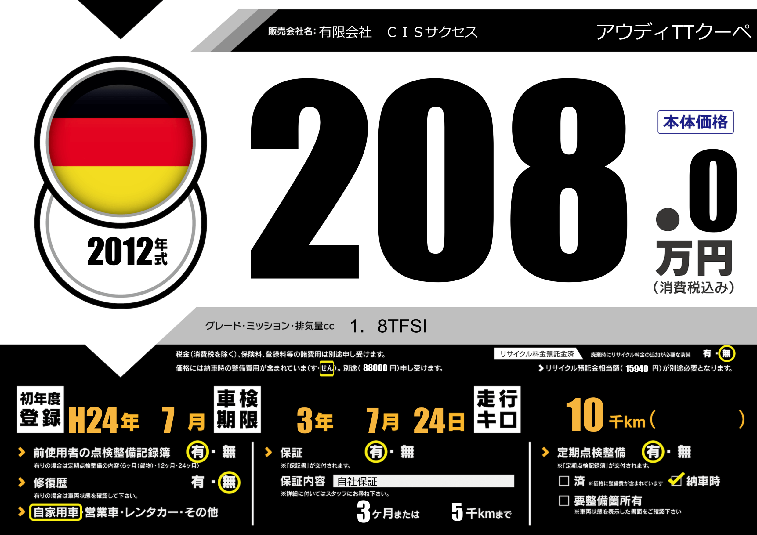 | 車名 | アウディTTクーペ | グレード ミッション 排気量 |