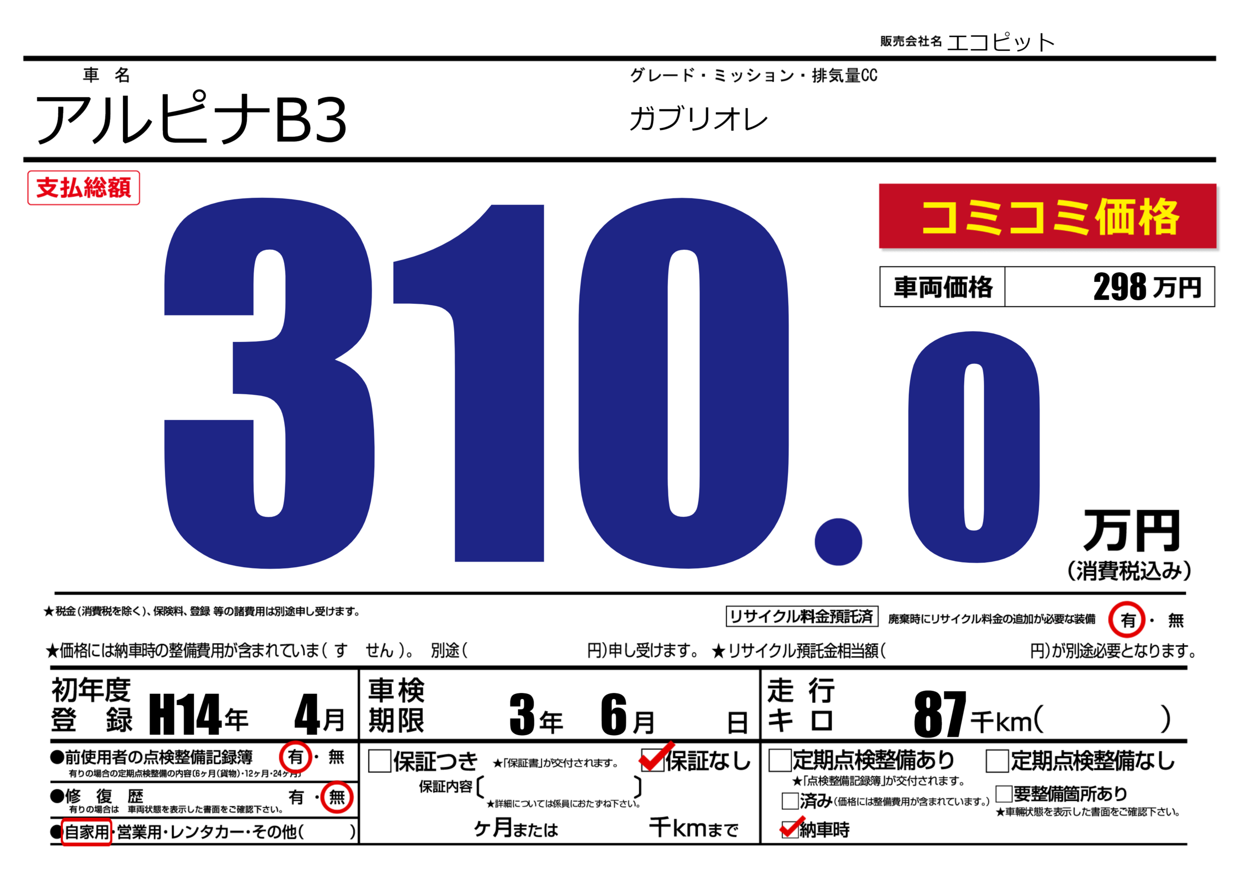 | 走行キロ | 8.7万km | 初年度登録 | H14年4月 |