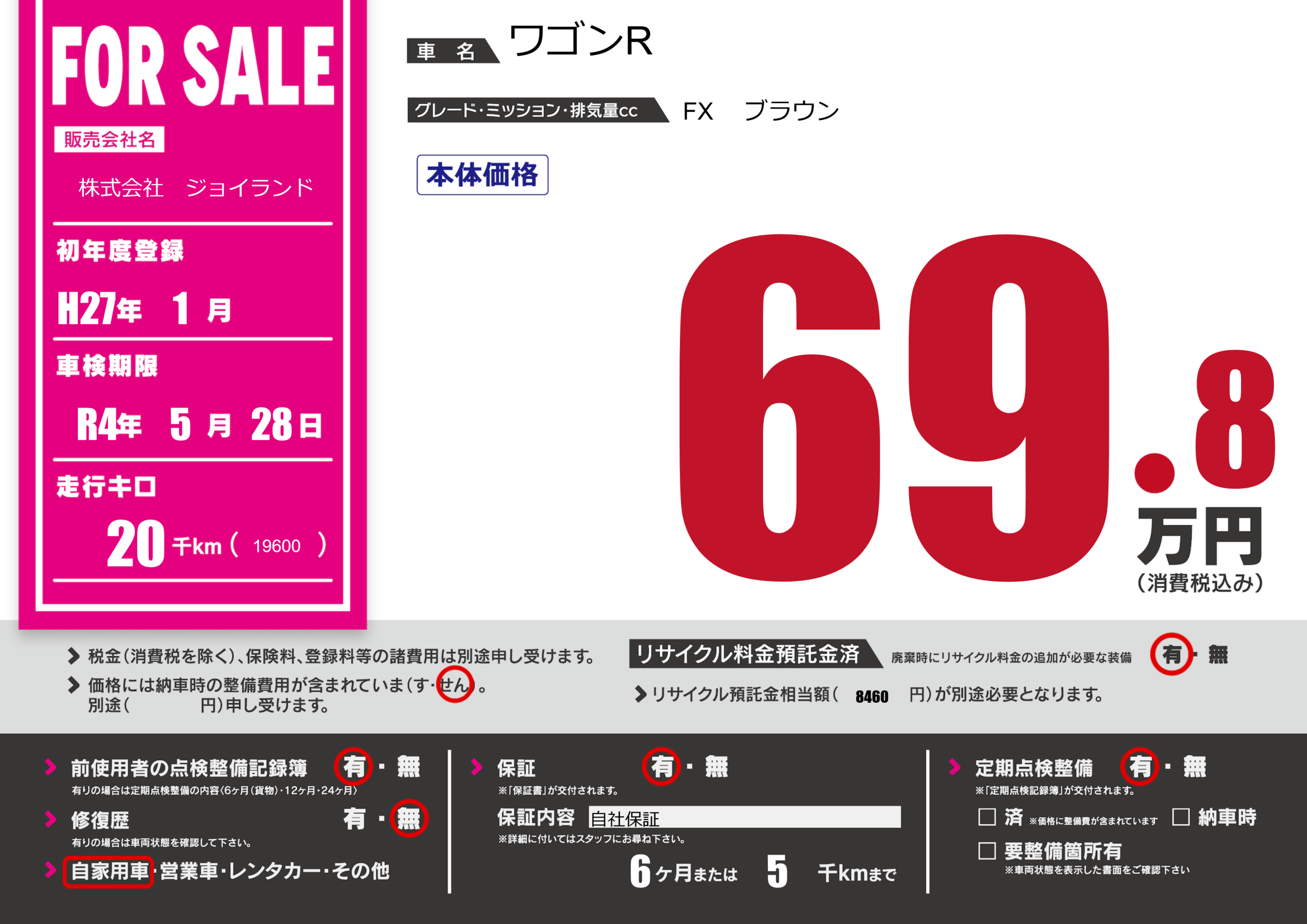 | 車名 | ワゴンR | グレード ミッション 排気量 |