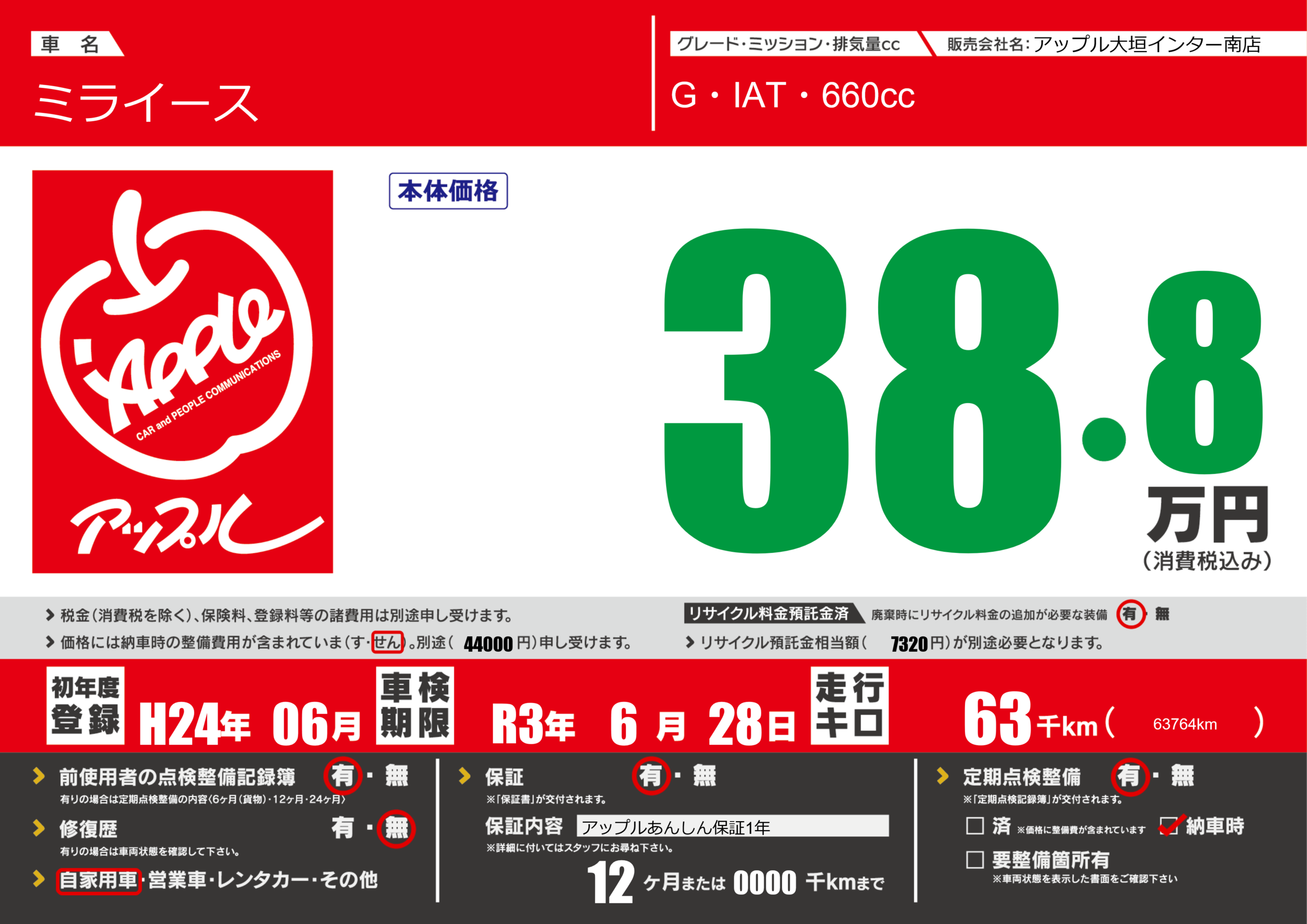 保証付き 保証内容(アップルあんしん保証1年) 12ヶ月または(0000)千kmまで |