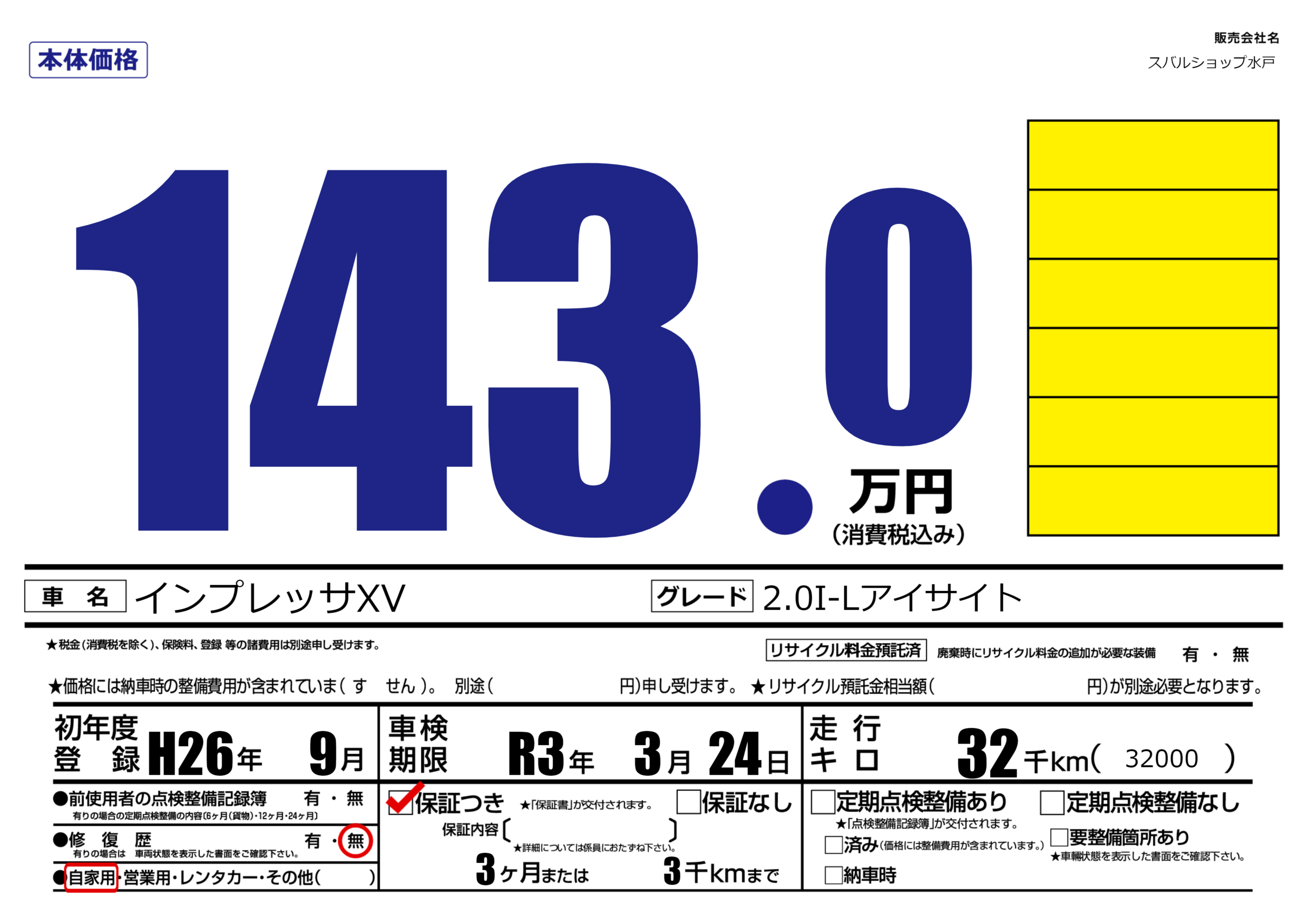 保証付き 保証内容(---) 3ヶ月または(3)千kmまで |