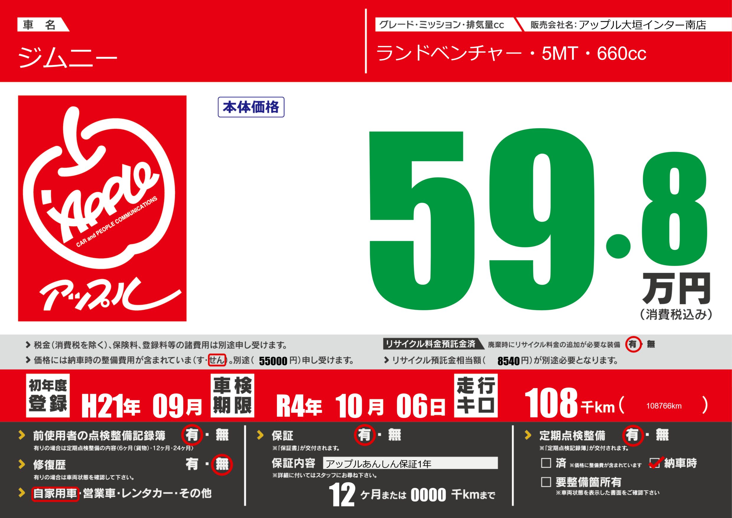 保証付き 保証内容(アップルあんしん保証1年) 12ヶ月または(0000)千kmまで |