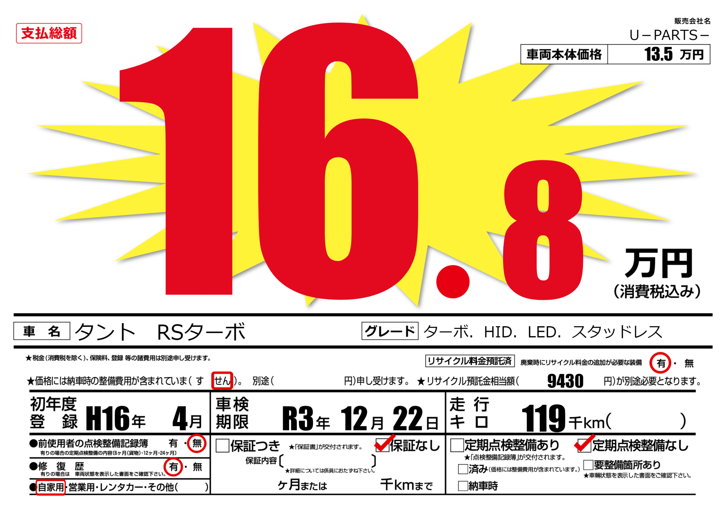 | 車名 | タント RSターボ | グレード ミッション 排気量 |