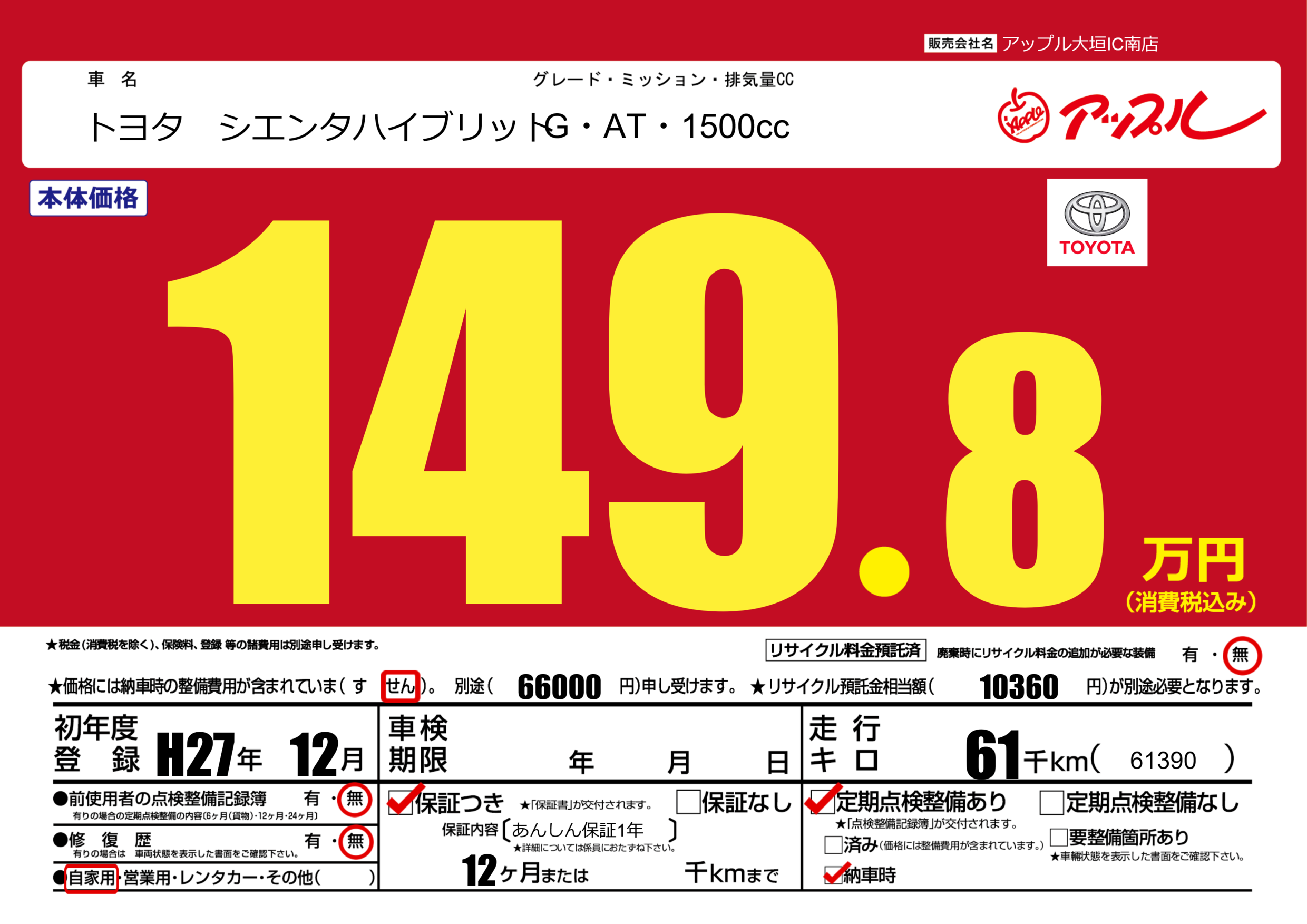 | 車名 | トヨタ シエンタハイブリット | グレード ミッション 排気量 |