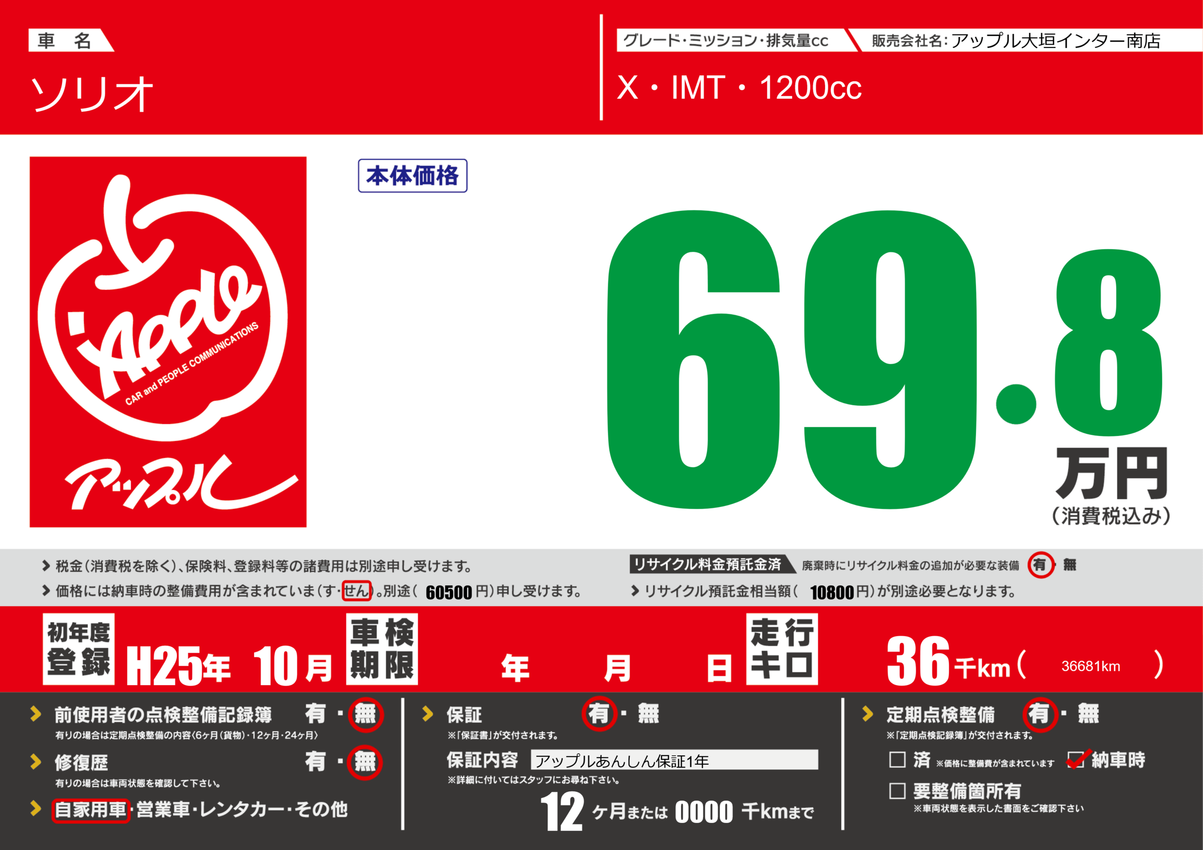 | 車名 | ソリオ | グレード ミッション 排気量 |