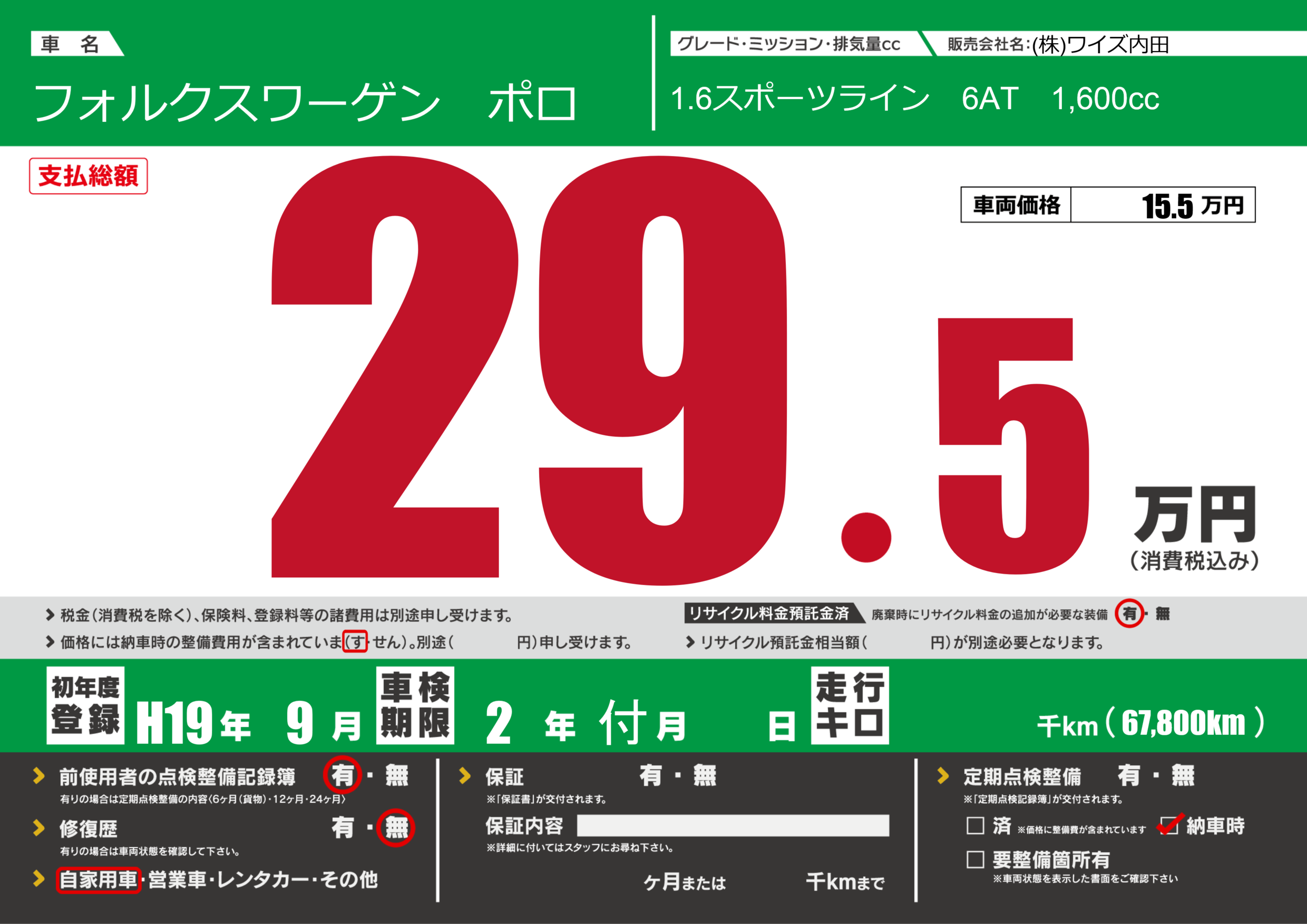 | 車名 | フォルクスワーゲン ポロ | グレード ミッション 排気量 |