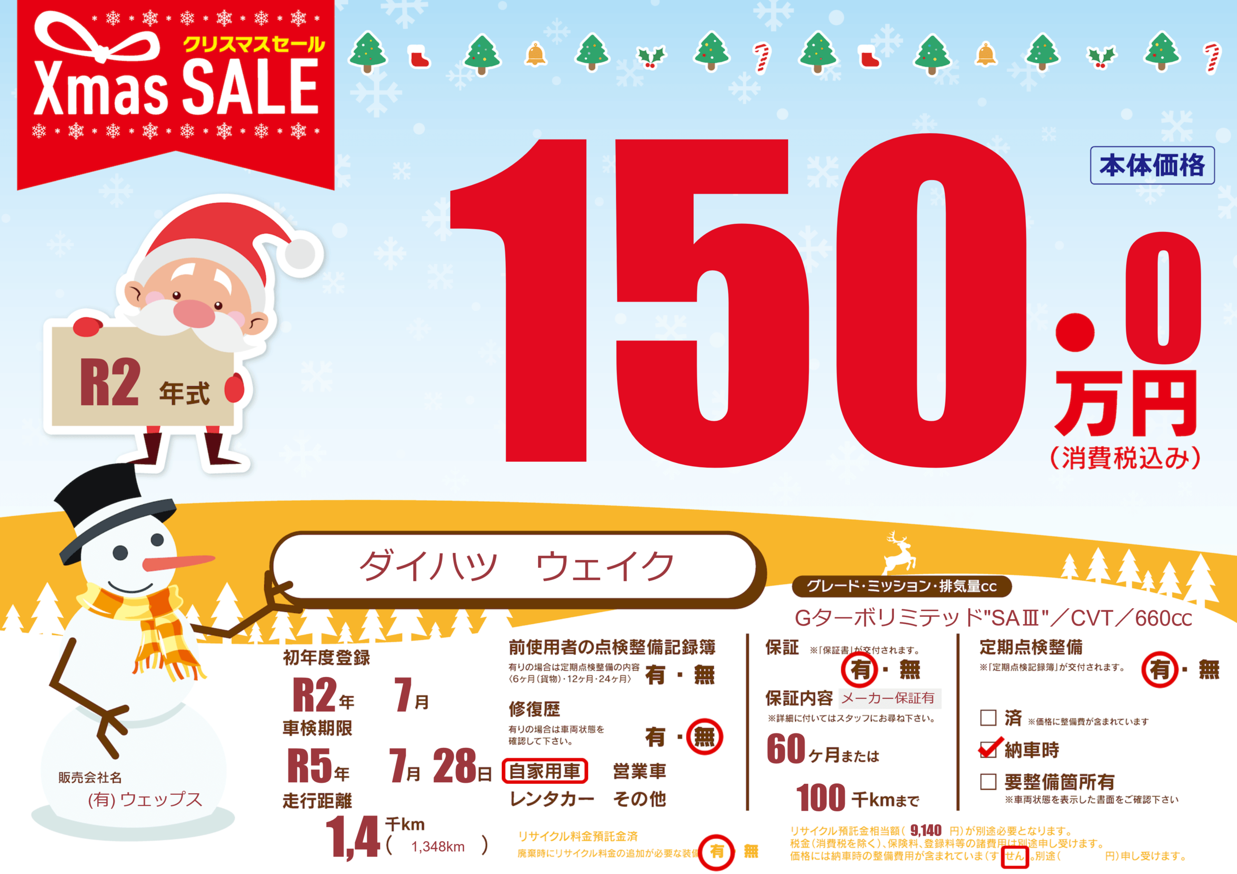 | 定期点検整備 | 定期点検整備あり 納車時あり | ||