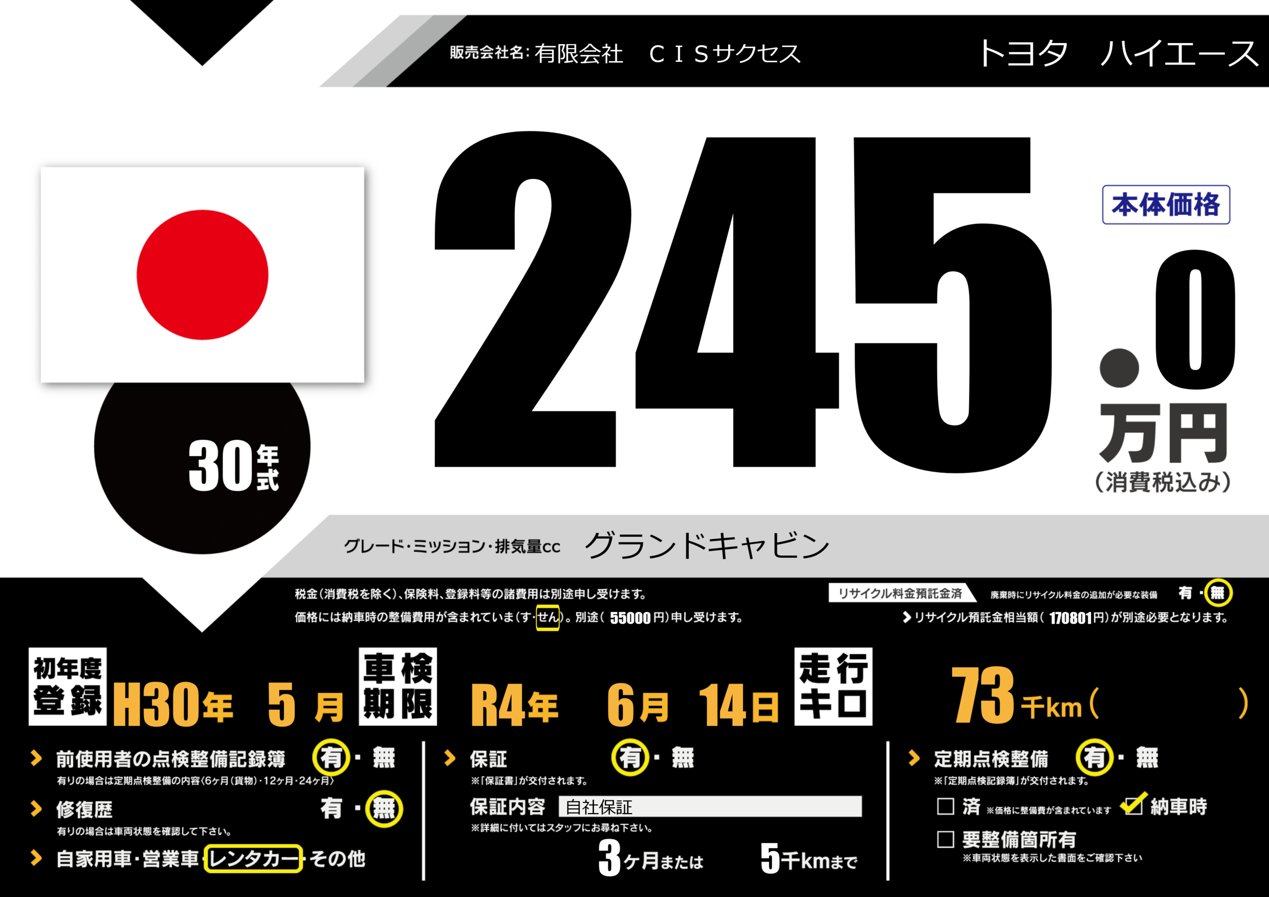 | 車名 | トヨタ ハイエース | グレード ミッション 排気量 |