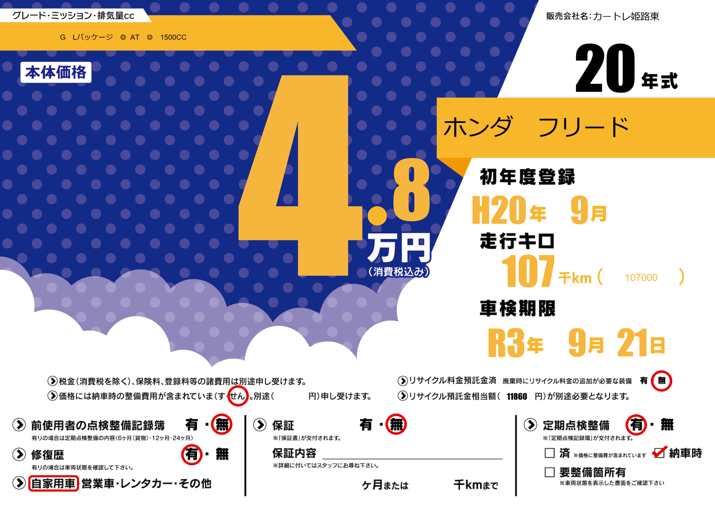 | 車名 | ホンダ フリード | グレード ミッション 排気量 |